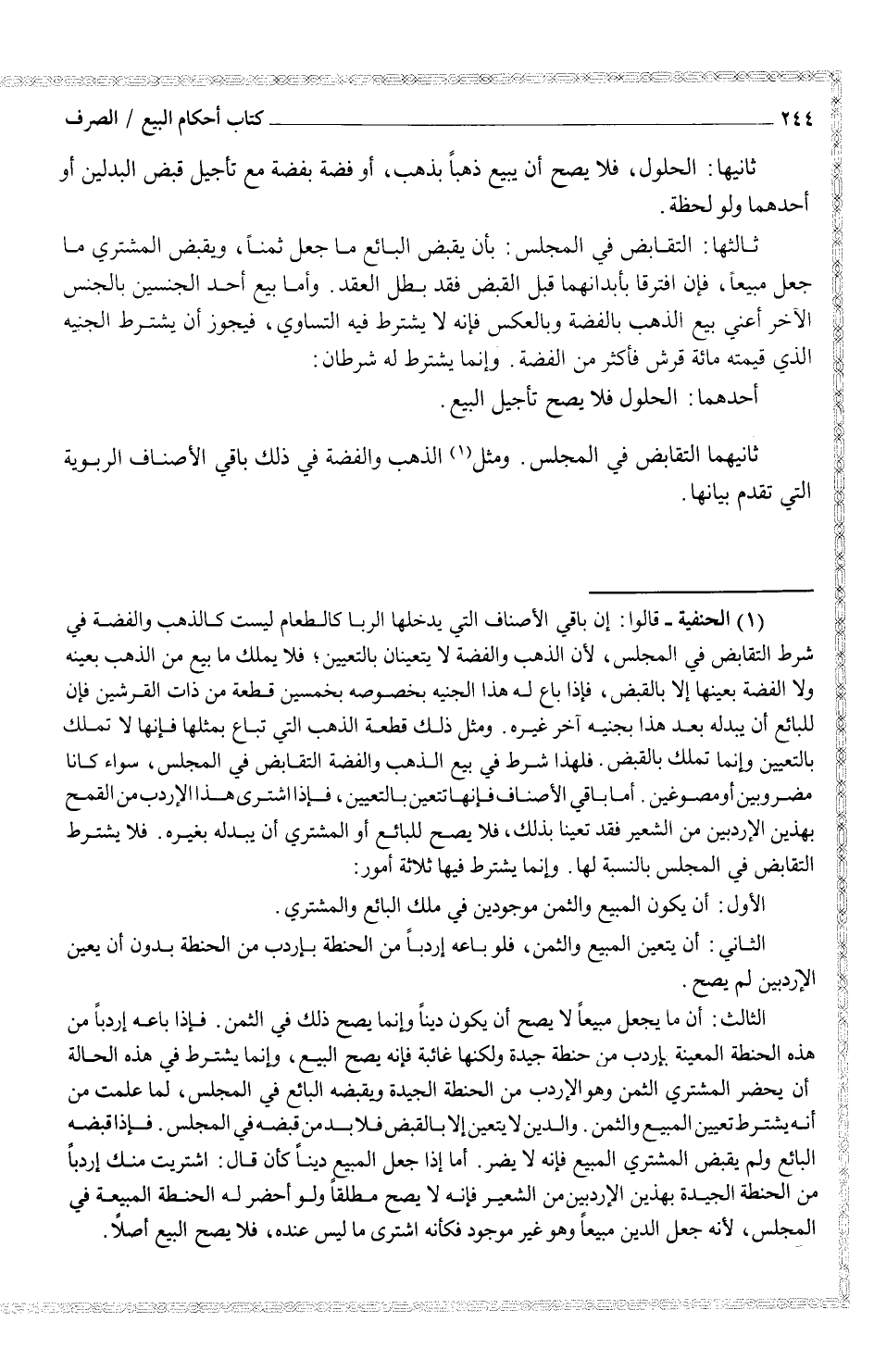 ثالثها: التقابض في المجلس: بأن يقبض البائع ما جعل ثمناً، ويقبض المشتري ما جعل مبيعاً، فإن افترقا بأبدانهما قبل القبض فقد بطل العقد. وأما بيع أحد الجنسين بالجنس الآخر أعني بيع الذهب بالفضة بوالعكس فإنه لا يشترط فيه التساوي، فيجوز أن يشترط الجنيه الذي قيمته مائة قرش فأكثر من الفضة. وإنما يشترط له شرطان: