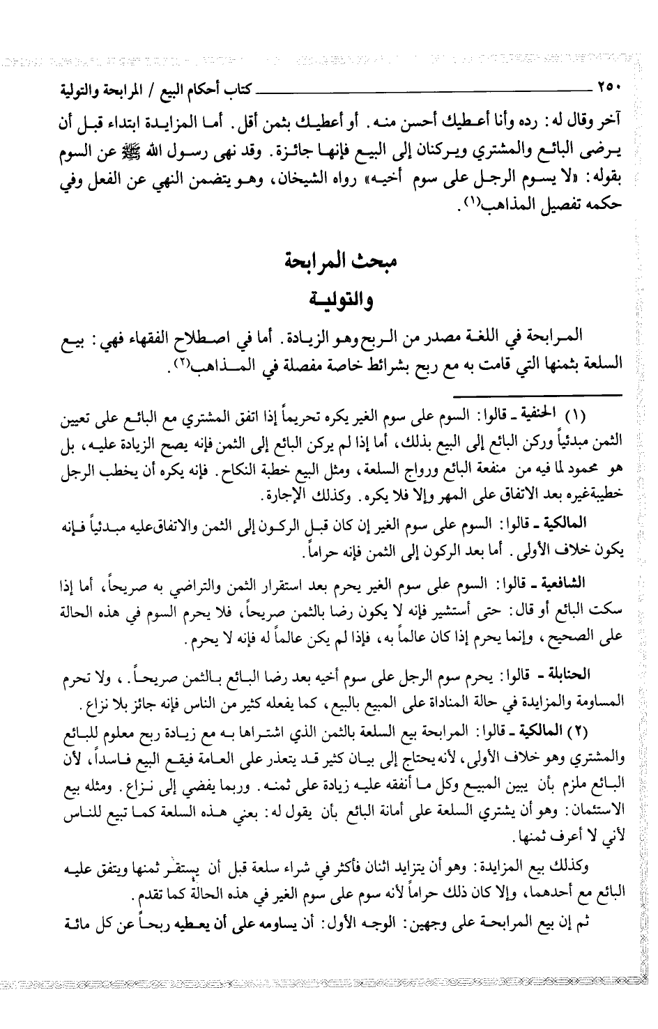 (¬2) المالكية - قالوا: المرابحة بيع السلعة بالثمن الذي اشتراها به مع زيادة ربح معلوم للبائع والمشتري وهو خلاف الأولى، لأنه يحتاج إلى بيان كثير قد يتعذر على العامة فيقع البيع فاسداً، لأن البائع ملزم بأن يبين المبيع وكل ما أنفقه عليه زيادة على ثمنه. وربما يفضي إلى نزاع. ومثله بيع الاستئمان: وهو أن يشتري السلعة على أمانة البائع بأن يقول له: بعني هذه السلعة كما تبيع للناس لأني لا أعرف ثمنها.