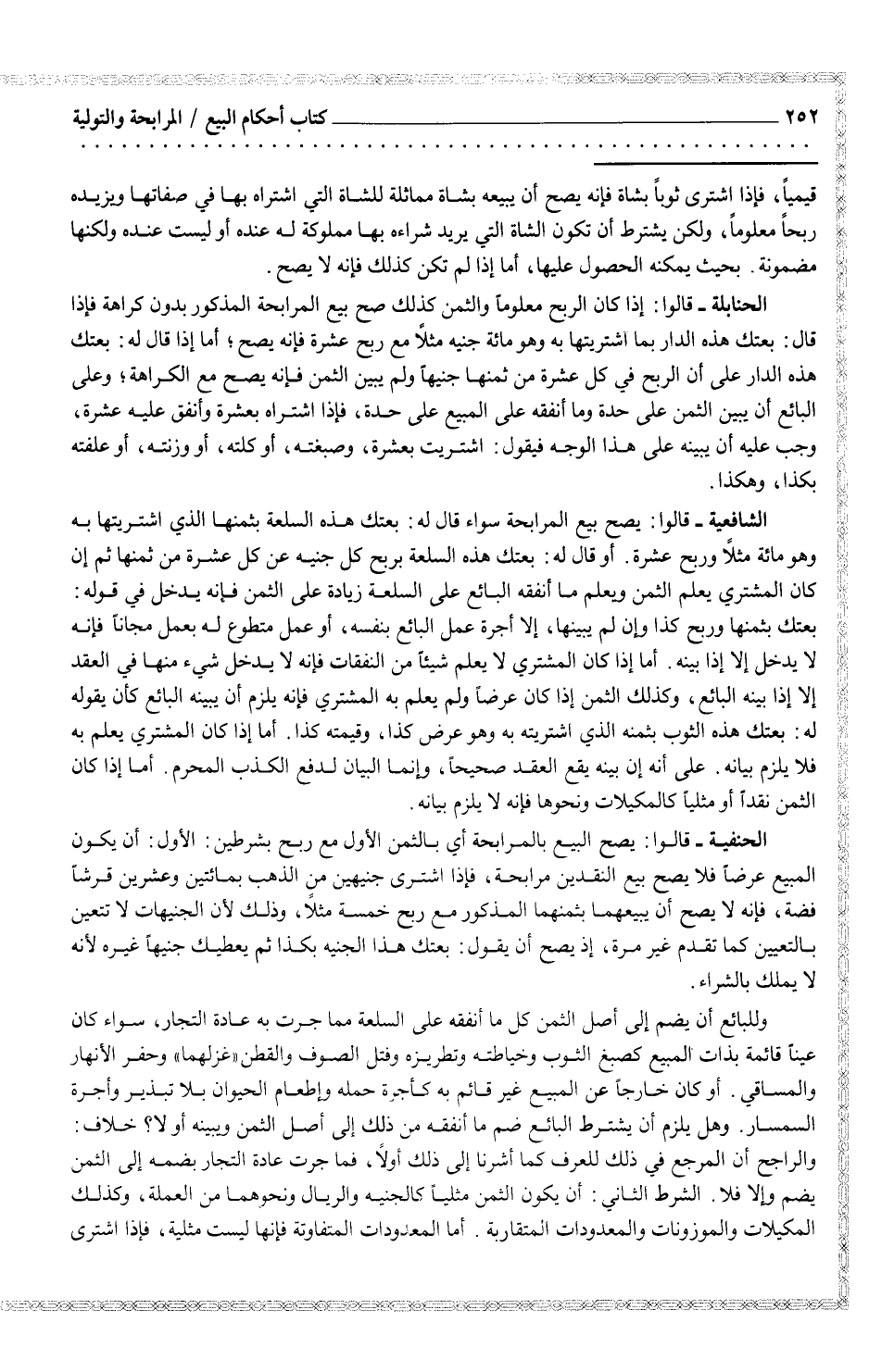الحنفية - قالوا: يصح البيع بالمرابحة أي بالثمن الأول مع ربح بشرطين: الأول: أن يكون المبيع عرضاً فلا يصح بيع النقدين مرابحة، فإذا اشترى جنهين من الذهب بمائتين وعشرين قرشاً فضة، فإنه لا يصح أن يبيعهما بثمنهما المذكور مع ربح خمسة مثلاً، وذلك لأن الجنيهات لا تتعين بالتعيين كما تقدم غير مرة، إذ يصح أن يقول: بعتك هذا الجنيه بكذا ثم يعطيك جنيهاً غيره لأنه لا يملك بالشراء.