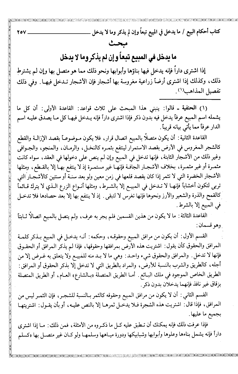 (¬1) الحنفية - قالوا: ينبني هذا المبحث على ثلاث قواعد: القاعدة الأولى: أن كل ما يشمله اسم المبيع عرفاً يدخل فيه بدون ذكر فإذا اشترى داراً فإنه يدخل فيها كل ما يصدق عليه اسم الدار عرفاً مما يأتي بيانه قريباً.