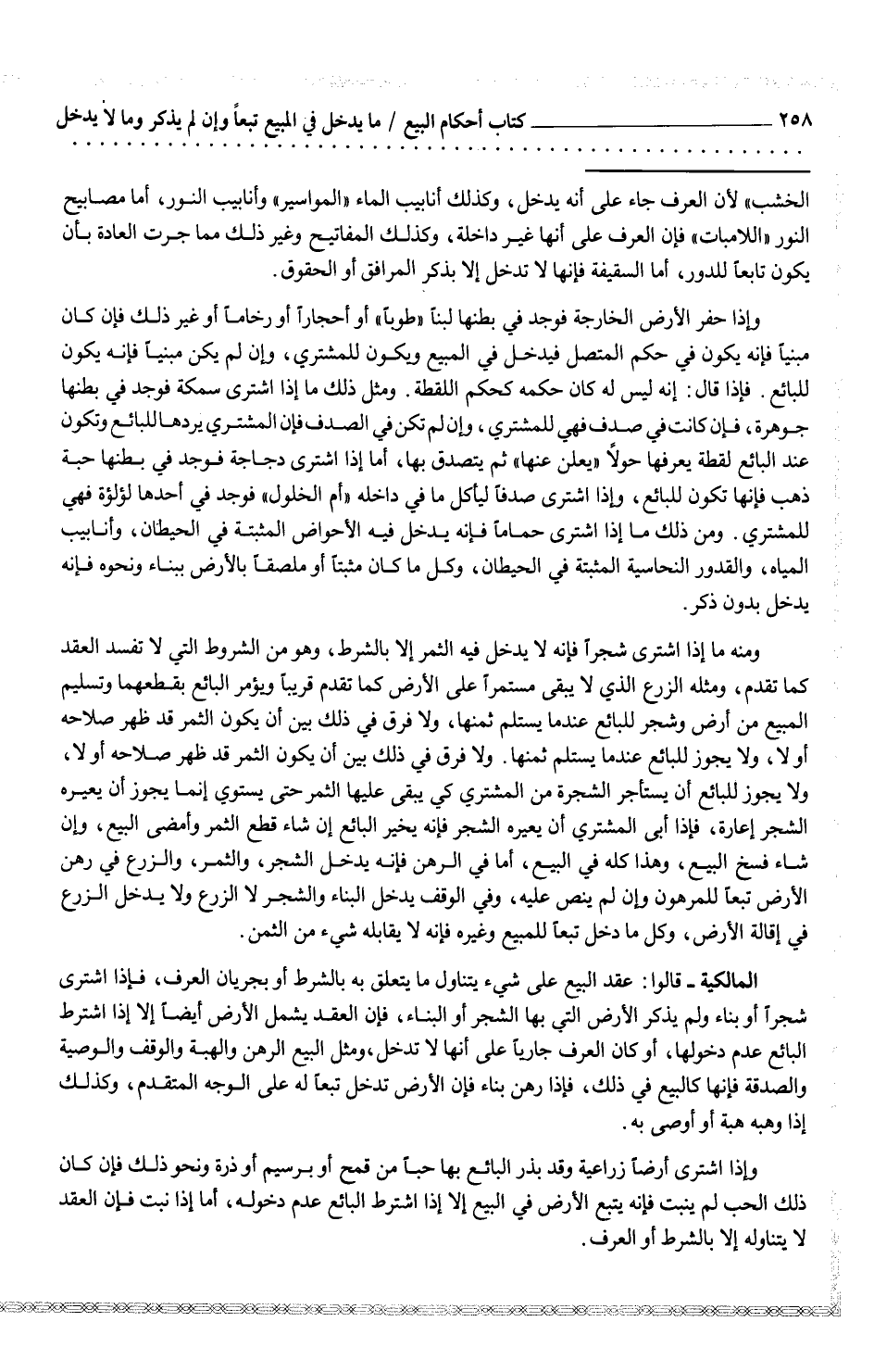 المالكية - قالوا: عقد البيع على شيء يتناول ما يتعلق به بالشرط أو بجريان العرف، فإذا اشترى شجراً أو بناء ولم يذكر الأرض التي بها الشجر أو البناء، فإن العقد يشمل الأرض أيضاً إلا إذا اشترط البائع عدم دخولها، أو كان العرف جارياً على أنها لا تدخل، ومثل البيع الرهن والهبة والوقف والوصية والصدقة فإنها كالبيع في ذلك، فإذا رهن بناء فإن الأرض تدخل تبعاً له على الوجه المتقدم، وكذلك إذا وهبه هبة أو أوصى به.