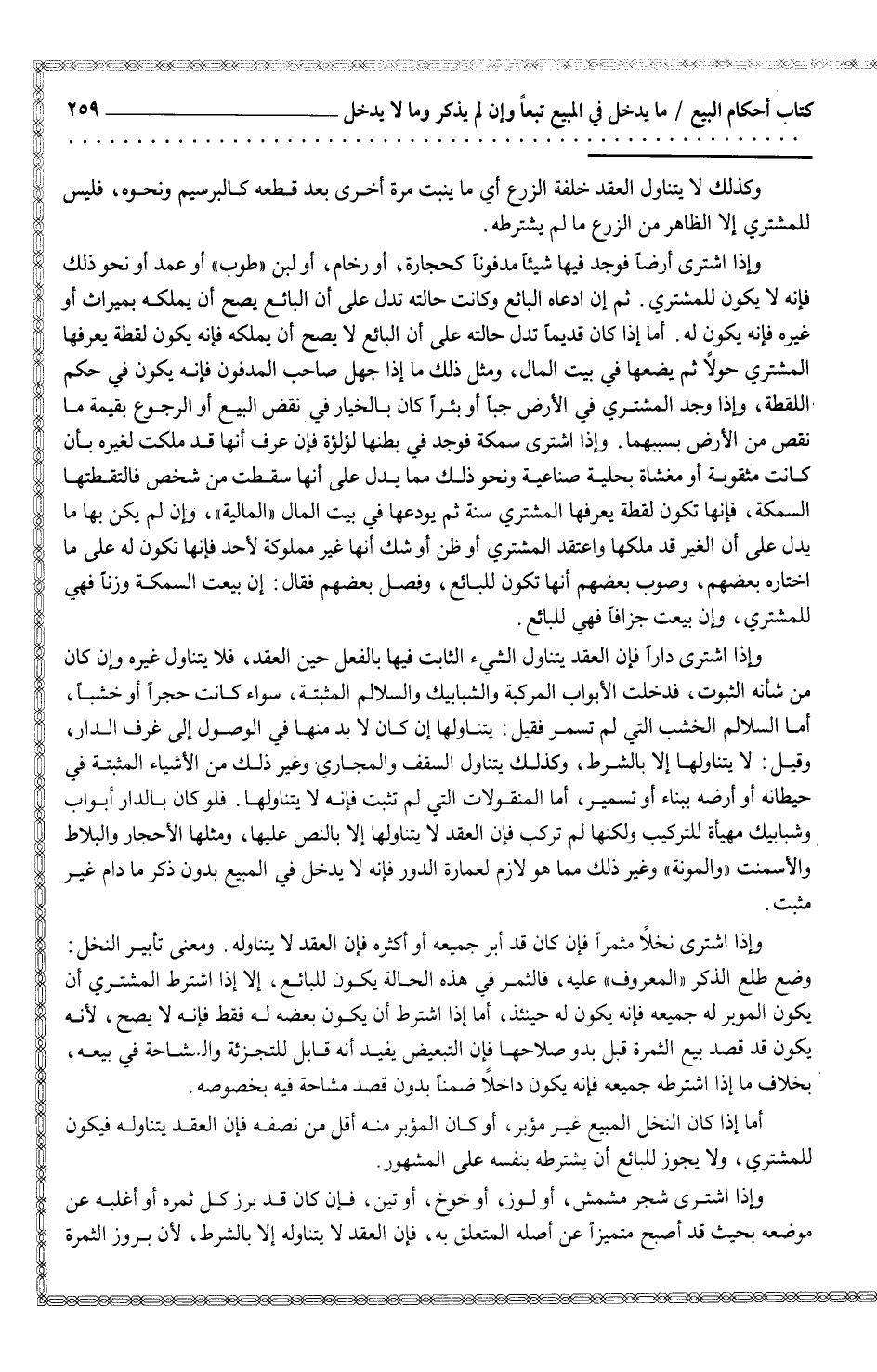 وإذا اشترى نخلاً مثمراً فإن كان قد أبر جميعه أو أكثره فإن العقد لا يتناوله. ومعنى تأبير النخل: وضع طلع الذكر "المعروف" عليه، فالثمر في هذه الحالة يكون للبائع، إلا إذا اشترك المشتري أن يكون الموبر له جميعه فإنه يكون له حينئذ، أما إذا اشترط أن يكون بعضه له فقط فإنه لا يصح، لأنه يكون قد قصد بيع الثمرة قبل بدو صلاحها فإن التبعيض يفيد أنه قابل للتجزئة والمشاحة في بيعه، بخلاف ما إذا اشترطه جميعه فإنه يكون داخلاً ضمناً بدون قصد مشاحة فيه بخصوصه.