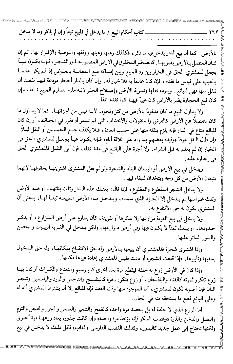 بالأرض. كما أن بيع الدار يدخل فيه ما ذكر، فكذلك رهنها وهبتها ووقفها والوصية والإقرار بها. ثم إن كان المتصل بالأرض يضربها. كالصخر المخلوق في الأرض المضر بجذور الشجر، فإنه يكون عيباً يجعل للمشتري الحق في الخيار بين رد المبيع وبين إمساكه مع المطالبة بالعوض إذا لم يكن عالماً بالعيب على قياس ما تقدم، فإن كان عالماً به فلا خيار له. وإن كان بالدار أحجار مودعة فيها بقصد أن تنقل منها فهي للبائع. ويلزمه نقلها وتسوية الرض وإصلاح الحفر لأنه ملزم بتسليم المبيع تاماً، وإن كان قلع الحجارة يضر بالأرض كان عيباً فيها كما تقدم آنفاً.