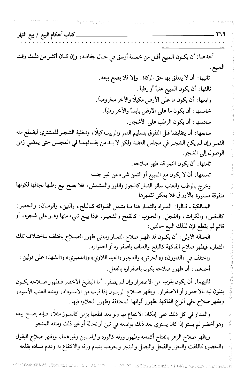 ثانيهما: أن يكون يقرب من الاصفرار وإن لم يصفر. أما البطيخ الأخضر فظهور صلاحه يكون بتلون لبه بالاحمرار أو الاصفرار. ويظهر صلاح الزيتون إذا قرب من الاسوداد، ومثله العنب الأسود، ويظهر صلاح باقي أنواع الفاكهة بظهور ألوانها المختلفة وظهور الحلاوة فيها.
