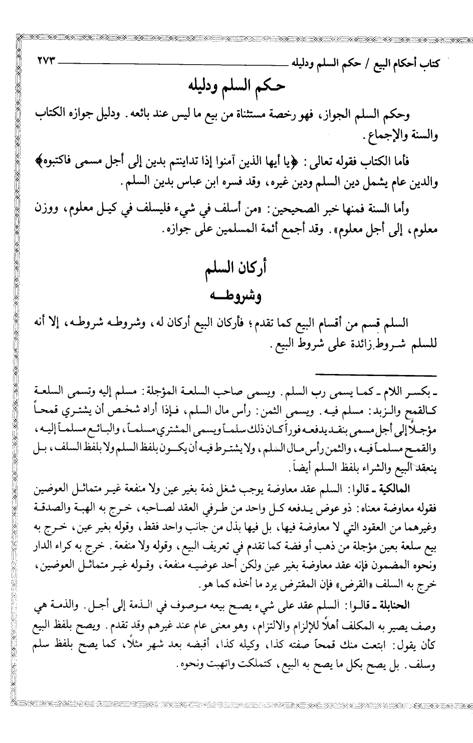 وأما السنة فمنها خبر الصحيحين: "ومن أسلف في شيء فليسلف في كيل معلوم، ووزن معلوم، إلى أجل معلوم". وقد أجمع أئمة المسلمين على جوازه.