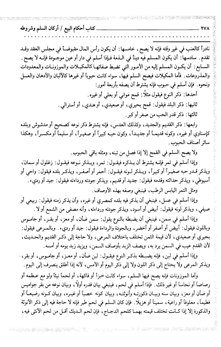 نادراً كالعنب في غير وقته فإنه لا يصح، خامسها: أن يكون رأس المال مقبوضاً في مجلس العقد وقد تقدم. سادسها: أن يكون المسلم فيه ديناً في الذمة فإذا أسلم في دار أو عين موجودة فإنه لا يصح. السابع: أن يكون المسلم إليه من الأمور التي تضبط صفاتها كالمكيلات والموزونات والمعدودات والمذروعات. فأما المكيلات فيصح السلم فيها، سواء كانت حبوباً أو غيرها كالألبان والأدهان والعسل ونحوه. فإن أسلم في حبوب فإنه يشترط أن يصفه بأربعة أمور: