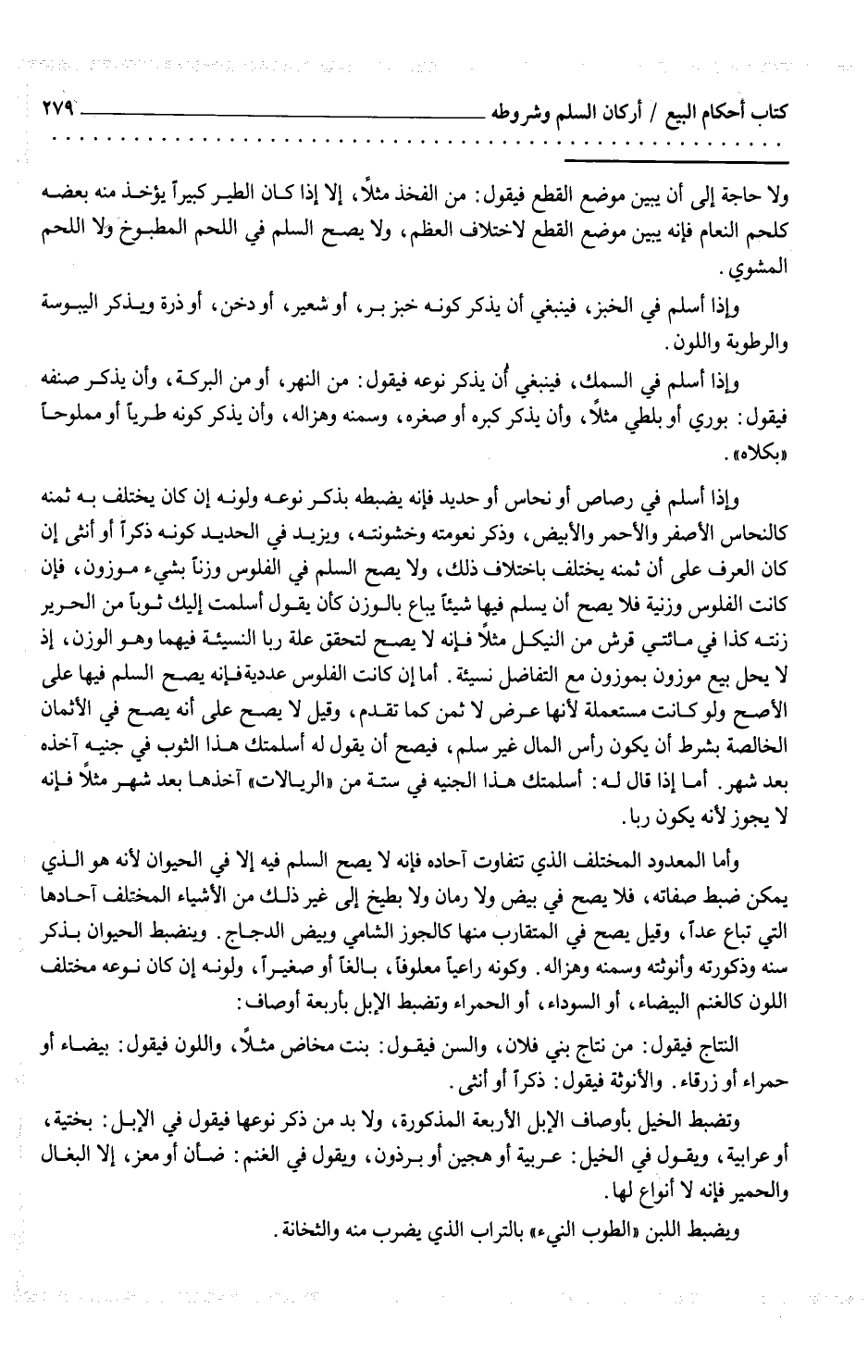 وأما المعدود المختلف الذي تتفاوت آحاده فإنه لا يصح السلم فيه إلا في الحيوان لأنه هو الذي يمكن ضبط صفاته، فلا يصح في بيض ولا رمان ولا بطيخ إلى غير ذلك من الأشياء المختلف آحادها التي تباع عداً، وقيل يصح في المتقارب منها كالجوز الشامي وبيض الدجاج. وينضبط الحيوان بذكر سنه وذكورته وأنوثته وسمنه وهزاله. وكونه راعياً معلوفاً، بالغاً أو صغيراً، ولونه إن كان نوعه مختلف اللون كالغنم البيضاء، أو السوداء، أو الحمراء وتضبط الإبل بأربعة أوصاف: