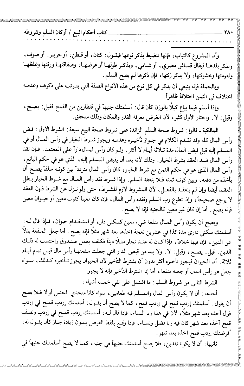 المالكية - قالوا: شروط صحة السلم الزائدة على شروط صة البيع سبعة: الشرط الأول: قبض رأس المال كله وقد تقدم الكلام في جواز تأخيره وعدمه ويجوز شرط الخيار في رأس المال أو في المسلم إليه قبل قبض المال مدة ثلاثة أيام لا أكثر. ولو كان رأس المال داراً على المعتمد. فإن نقد رأس المال فسد العقد بشرط الخيار. وذلك لأنه بعد أن يقبض المسلم إليه، الذي هو في حكم البائع، رأس المال الذي هو في حكم الثمن مع شرط الخيار، كان رأس المال متردداً بين كونه سلفاً يصح أن يأخذه من دفعه، وبين كونه ثمنه فلا ينعقد السلم. وإذا شرط نقد رأس المال مع شرط الخيار بطل العقد أيضاً وإن لم ينعقد بالفعل، لأن المشروط لازم للشرط، حتى ولو نزل عن الشرط فإن العقد لا يرجع صحيحاً، وإذا تطوع رب السلم ونقده رأس المال، فإن كان معيناً كثوب معين أو حيوان معين فإنه يصح. أما إن كان غير معين كالجنيه فإنه لا يصح.