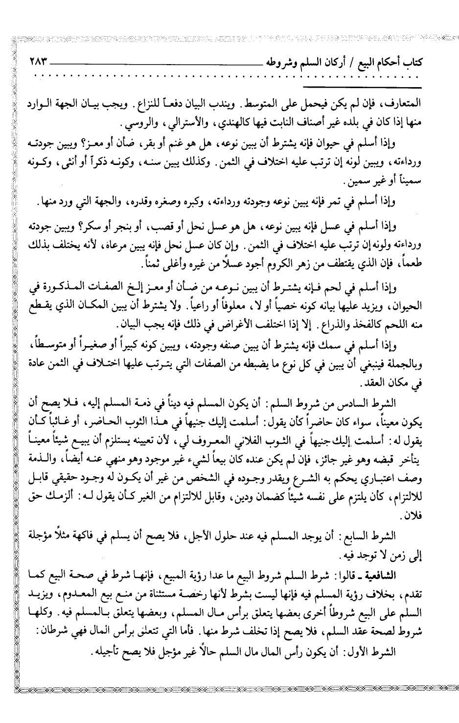 وإذا أسلم في حيوان فإنه يشترط أن يبين نوعه، هل هو غنم أو بقر، ضأن أو معز؟ ويبين جودته ورداءته، ويبين لونه إن ترتب عليه اختلاف في الثمن. وكذلك يبين سنه، وكونه ذكراً أو أنثى، وكونه سميناً أو غير سمين.
