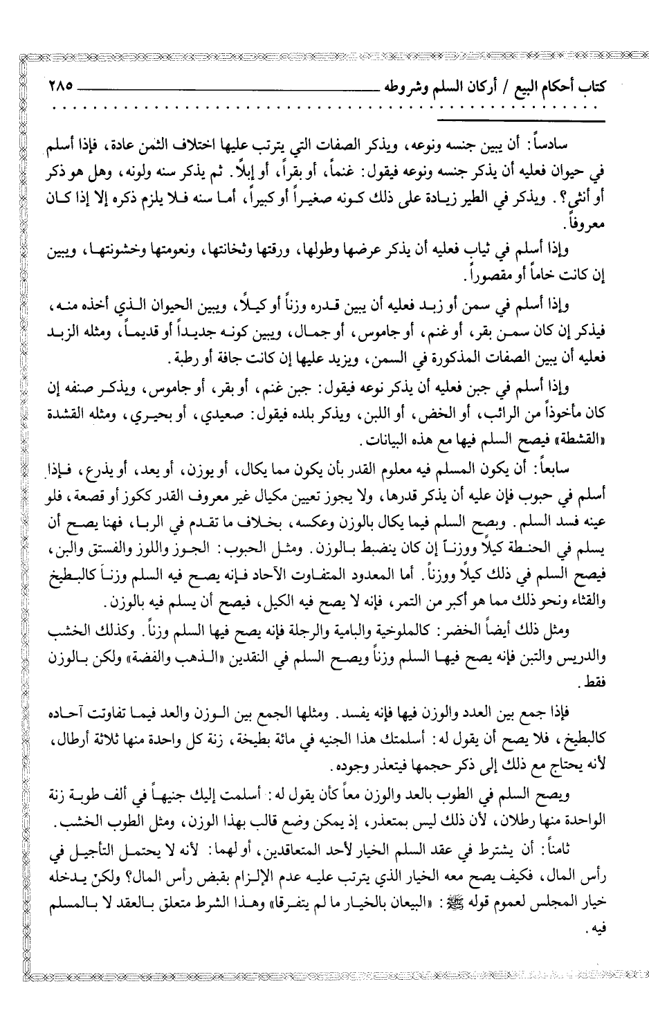 سادساً: أن يبين جنسه ونوعه، ويذكر الصفات التي يترتب عليها اختلاف الثمن عادة، فإذا أسلم في حيوان فعليه أن يذكر جنسه ونوعه فيقول: غنماً، أو بقراً، أو إبلاً. ثم يذكر سنه ولونه، وهل هو ذكر أو أنثى؟. ويذكر في الطير زيادة على ذلك كونه صغيراً أو كبيراً، أما سنه فلا يلزم ذكره إلا إذا كان معروفاً.