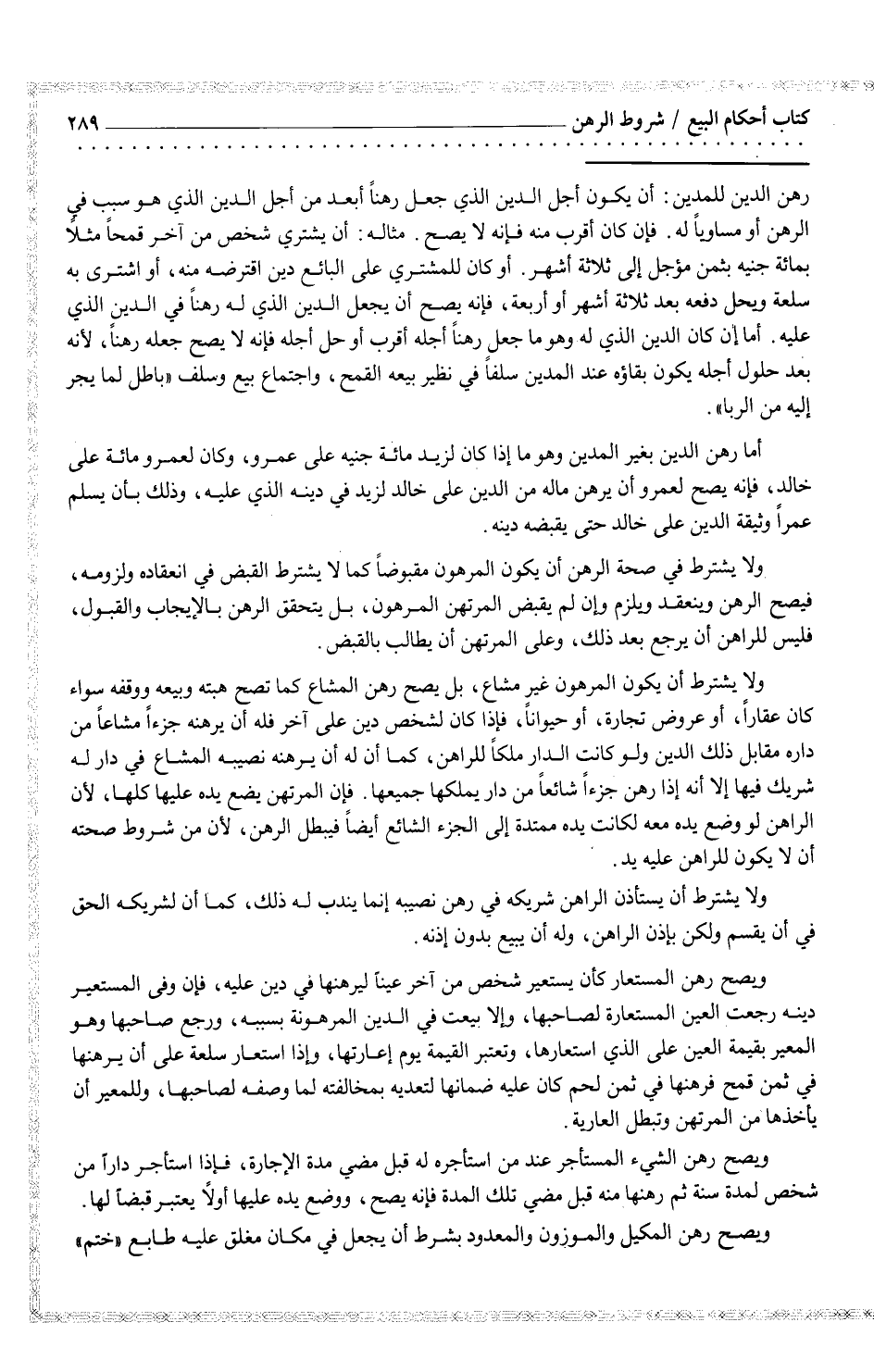 رهن الدين للمدين: أن يكون أجل الدين الذي جعل رهناً أبعد من أجل الدين الذي هو سبب في الرهن أو مساوياً له. فإن كان أقرب منه فإنه لا يصح. مثاله: أن يشتري شخص من آخر قمحاً مثلاً بمائة جنيه بثمن مؤجل إلى ثلاثة أشهر. أو كان للمشتري على البائع دين اقترضه منه، أو اشترى به سلع ويحل دفعه بعد ثلاثة أشهر أو أربعة، فإنه يصح أن يجعل الدين الذي له رهناً في الدين الذي عليه. أما إن كان الدين له وهو ما جعل رهناً أجله أقرب أو حل فإنه لا يصح جعله رهناً، لأنه بعد حلول أجله يكون بقاؤه عند المدين سلفاً في نظير بيعه القمح، واجتماع بيع وسلف "باطل لما يجر إليه من الربا".