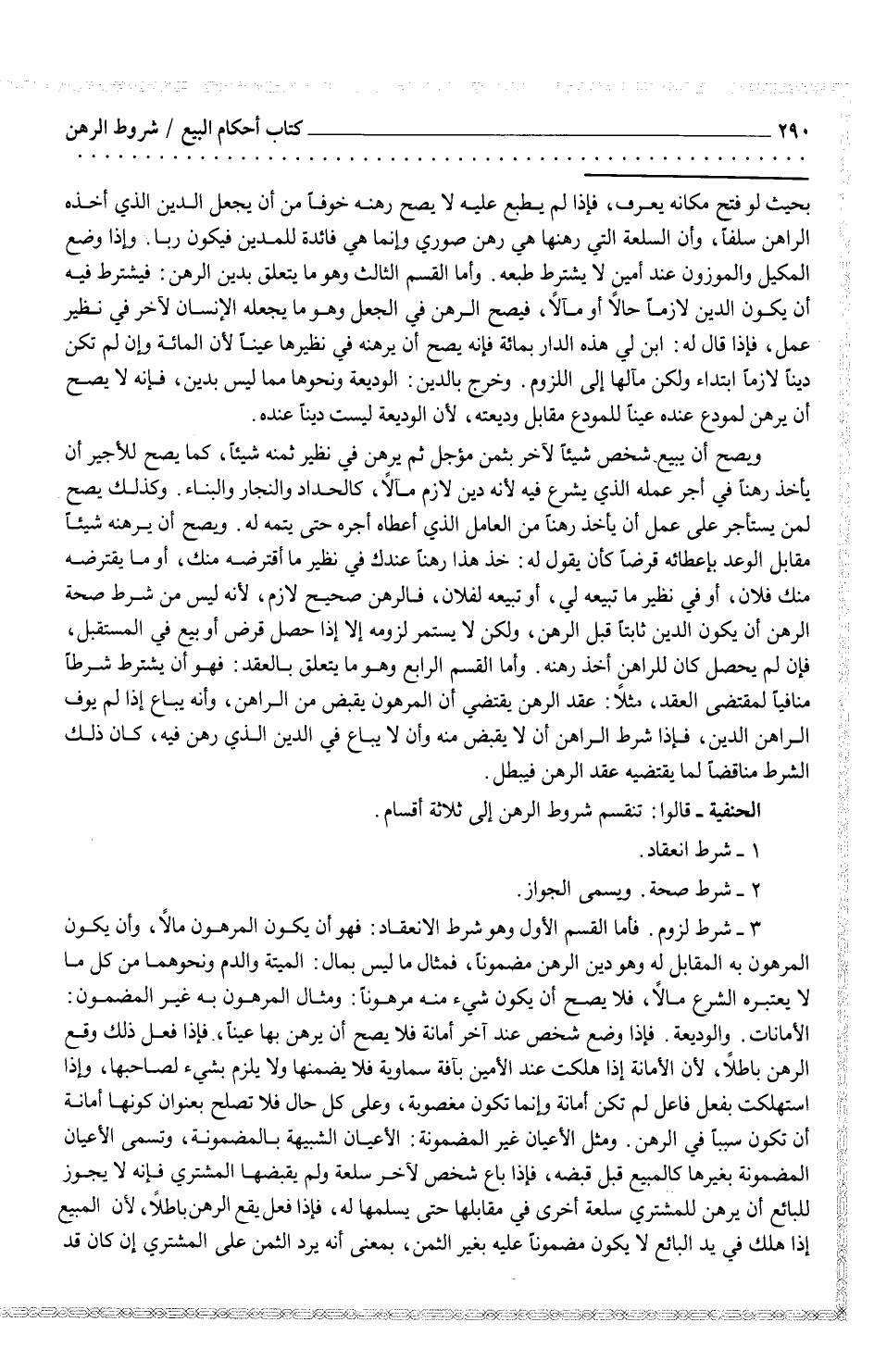 -3 - شرط لزوم. فأما القسم الأول وهو شرط الانعقاد: فهو أن يكون المرهون مالاً، وأن يكون المرهون به المقابل له وهو دين الرهن مضموناً، فمثال ما ليس بمال: الميتة والدم ونحوهما من كل ما لا يعتبره الشرع مالاً، فلا يصح أن يكون شيء منه مرهوناً: ومثال المرهون به غير المضمون: الأمانات. والوديعة. فإذا وضع شخص عند آخر أمانة فلا يصح أن يرهن بها عيناً، فإذا فعل ذلك وقع الرهن باطلاً، لأن الأمانة إذا هلكت عند الأمين بآفة سماوية فلا يضمنها ولا يلزم بشيء لصاحبها، وإذا استهلكت بفعل فاعل لم تكن أمانة وإنما تكون مغصوبة، وعلى كل حال فلا تصلح بعنوان كونها أمانة أن تكون سبباً في الرهن. ومثل الأعيان غير المضمونة: الأعيان الشبيهة بالمضمونة، وتسمى الأعيان المضمونة بغيرها كالمبيع قبل قبضه، فإذا باع شخص لآخر سلعة ولم يقبضها المشتري فإنه لا يجوز للبائع أن يرهن للمشتري سلعة أخرى في مقابلها حتى يسلمها له، فإذا فعل يقع الرهن باطلاً، لأن المبيع إذا هلك في يد البائع لا يكون مضموناً عليه بغير الثمن، بمعنى أنه يرد الثمن على المشتري إن كان قد