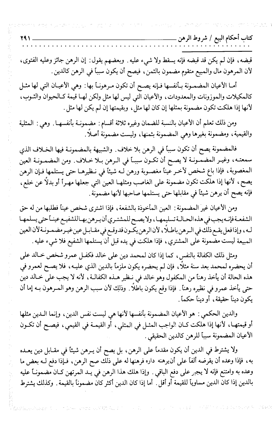 أما الأعيان المضمونة بأنفسها فإنه يصح أن تكون مرهوناً بها: وهي الأعيان التي لها مثل كالمكيلات والموزونات والمعدودات، والأعيان التي ليس لها مثل ولكن لها قيمة كالحيوان والثوب، لأنها إذا هلكت تكون مضمونة بمثلها إن كان لها مثل، وبقيمتها إن لم يكن لها مثل.