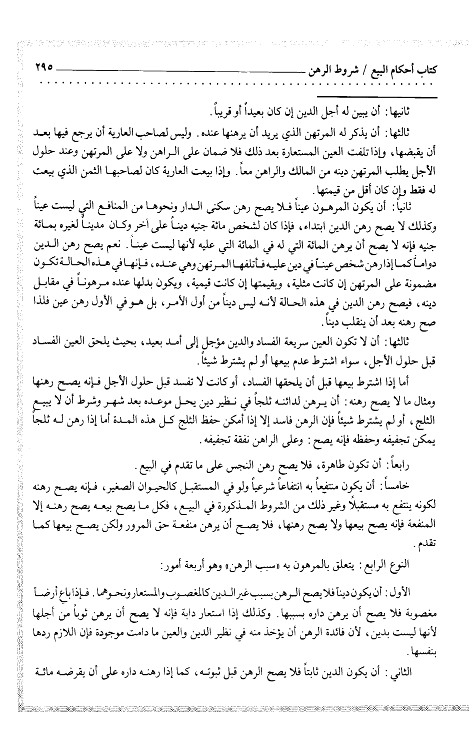خامساً: أن يكون منتفعاً به انتفاعاً شرعياً ولو في المستقبل كالحيوان الصغير، فإنه يصح رهنه لكونه ينتفع به مستقبلاً وغير ذلك من الشروط المذكورة في البيع، فكل ما يصح بيعه يصح رهنه إلا المنفعة فإنه يصح بيعها ولا يصح رهنها، فلا يصح أن يرهن منفعة حق المرور ولكن يصح بيعها كما تقدم.