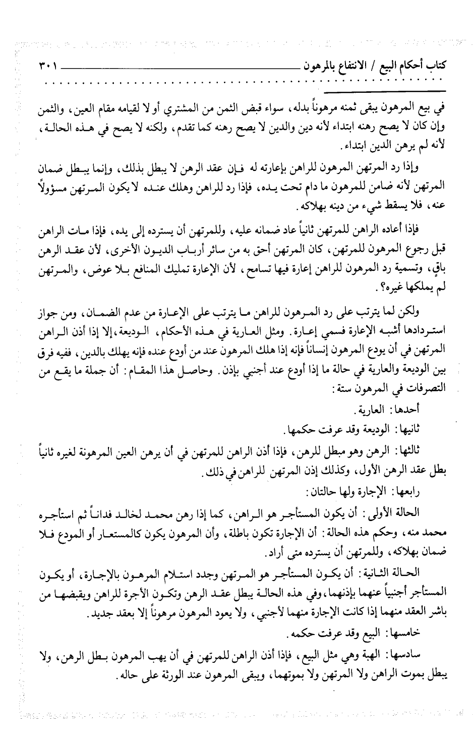 ولكن لم يترتب على رد المرهون للراهن ما يترتب على الإعارة من عدم الضمان، ومن جواز استردادها اشبه الإعارة فسمي إعارة. ومثل العارية في هذه الأحكام، الوديعة، إلا إذا أذن الراهن المرتهن في أن يودع المرهون إنساناً فإنه إذا هلك المرهون عند من أدع عنده فإنه يهلك بالدين، ففيه فرق بين الوديعة والعارية في حالة ما إذا أودع عند أجنبي بإذن. وحاصل هذا المقام: أن جملة ما يقع من التصرفات في المرهون ستة: