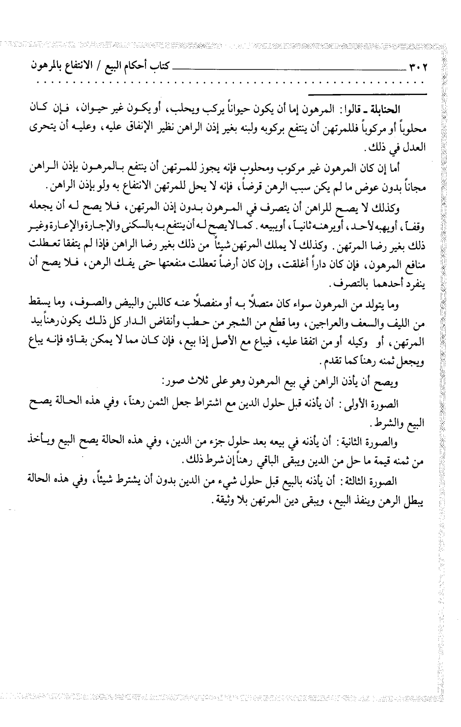 الحنابلة - قالوا: المرهون إما أن يكون حيواناً يركب ويحلب، أو يكون غير حيوان، فإن كان محلوباً أو مركوباً فللمرتهن أن ينتفع بركوبه ولبنه بغير إذن الراهن نظير الإنفاق عليه، وعليه أن يتحرى العدل في ذلك.