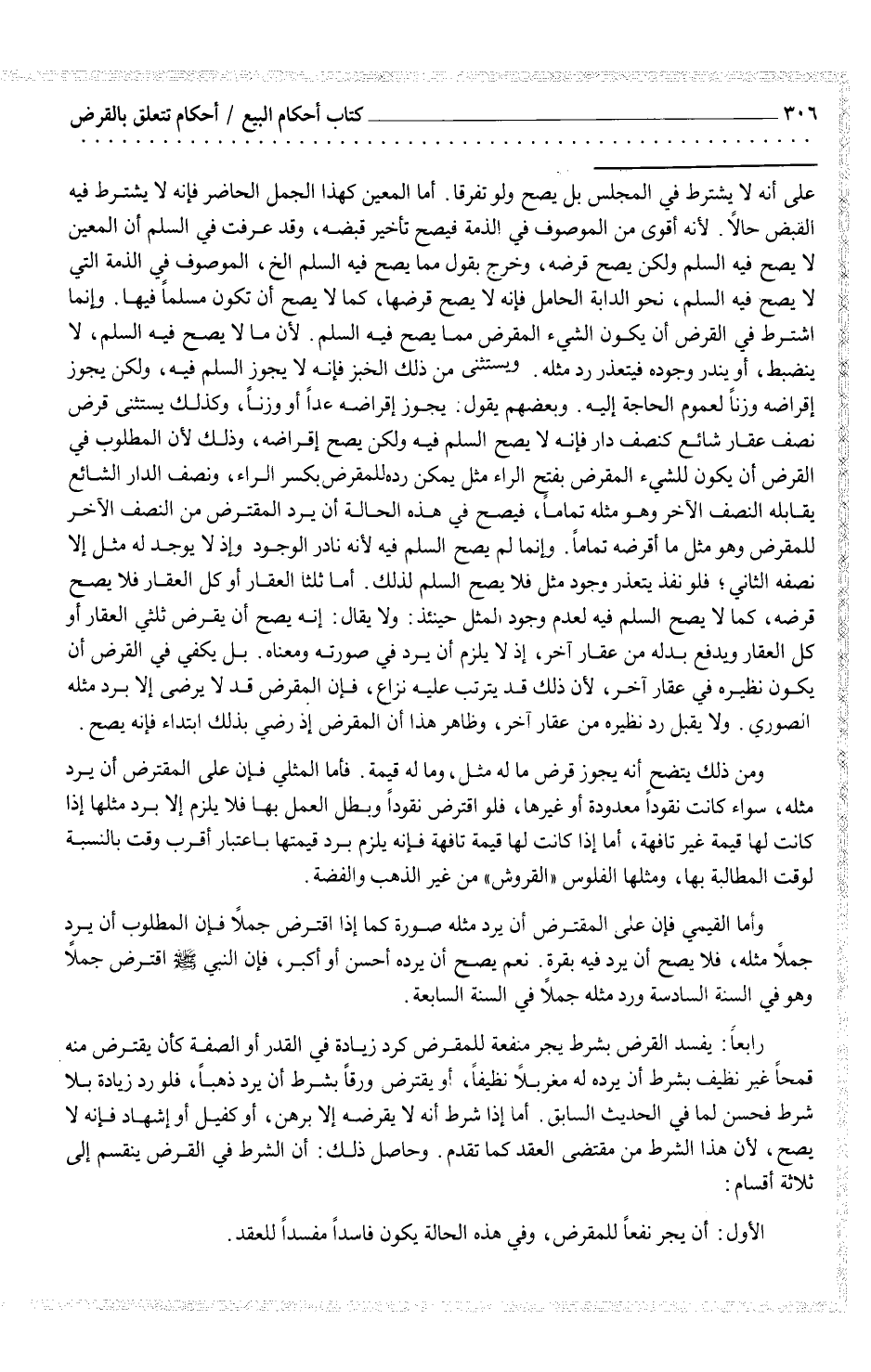 رابعاً: يفسد القرض بشرط يجر منفعة للمقرض كرد زيادة في القدر أو الصفة كأن يقترض منه قمحاً غير نظيف بشرط أن يرده له مغربلاً نظيفاً، أو يقترض ورقاً بشرط أن يرد ذهباً، فلو رد زيادة بلا شرط فحسن لما في الحديث السابق. أما إذا شرط أنه لا يقرضه إلا برهن، أو كفيل أو إشهاد فإنه لا يصح، لأن هذا الشرط من مقتضى العقد كما تقدم. وحاصل ذلك: أن الشرط في القرض ينقسم إلى ثلاثة أقسام: