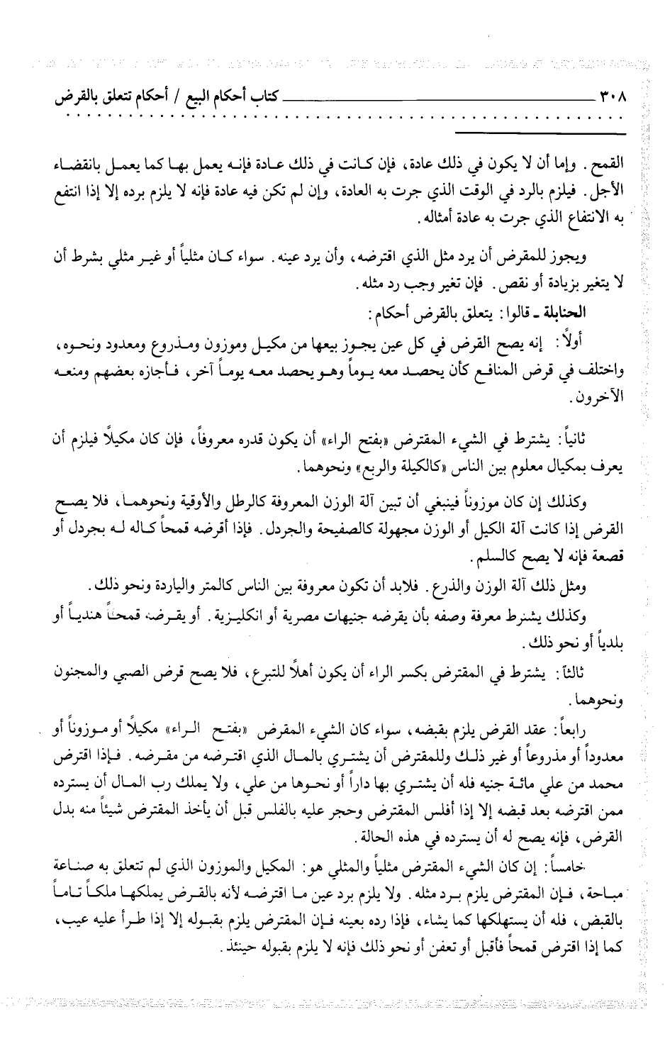 رابعاً: عقد القرض يلزم بقبضه، سواء كان الشيء المقرض "بفتح الراء" مكيلاً أو موزوناً أو معدوداً أو مذروعاً أو غير ذلك وللمقترض أن يشتري بالمال الذي اقترضه من مقرضه. فإذا اقترض محمد من علي مائة جنيه فله أن يشتري بها دارً أو نحوها من علي، ولا يملك رب المال أن يسترده ممن اقترضه بعد قبضه إلا إذا أفلس المقترض وحجر عليه بالفلس قبل أن يأخذ المقترض شيئاً منه بدل القرض، فإنه يصح له أن يسترده في هذه الحالة.