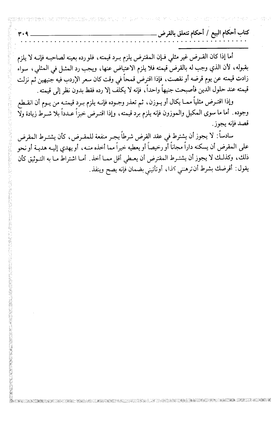 وإذا اقترض مثلياً مما يكال أو يوزن، ثم تعذر وجوده فإنه يلزم برد قيمته من يوم أن انقطع وجوده. أما ما سوى المكيل والموزون فإنه يلزم برد قيمته، وإذا اقترض خبزاً عدداً بلا شرط زيادة ولا قصد فإنه يجوز.