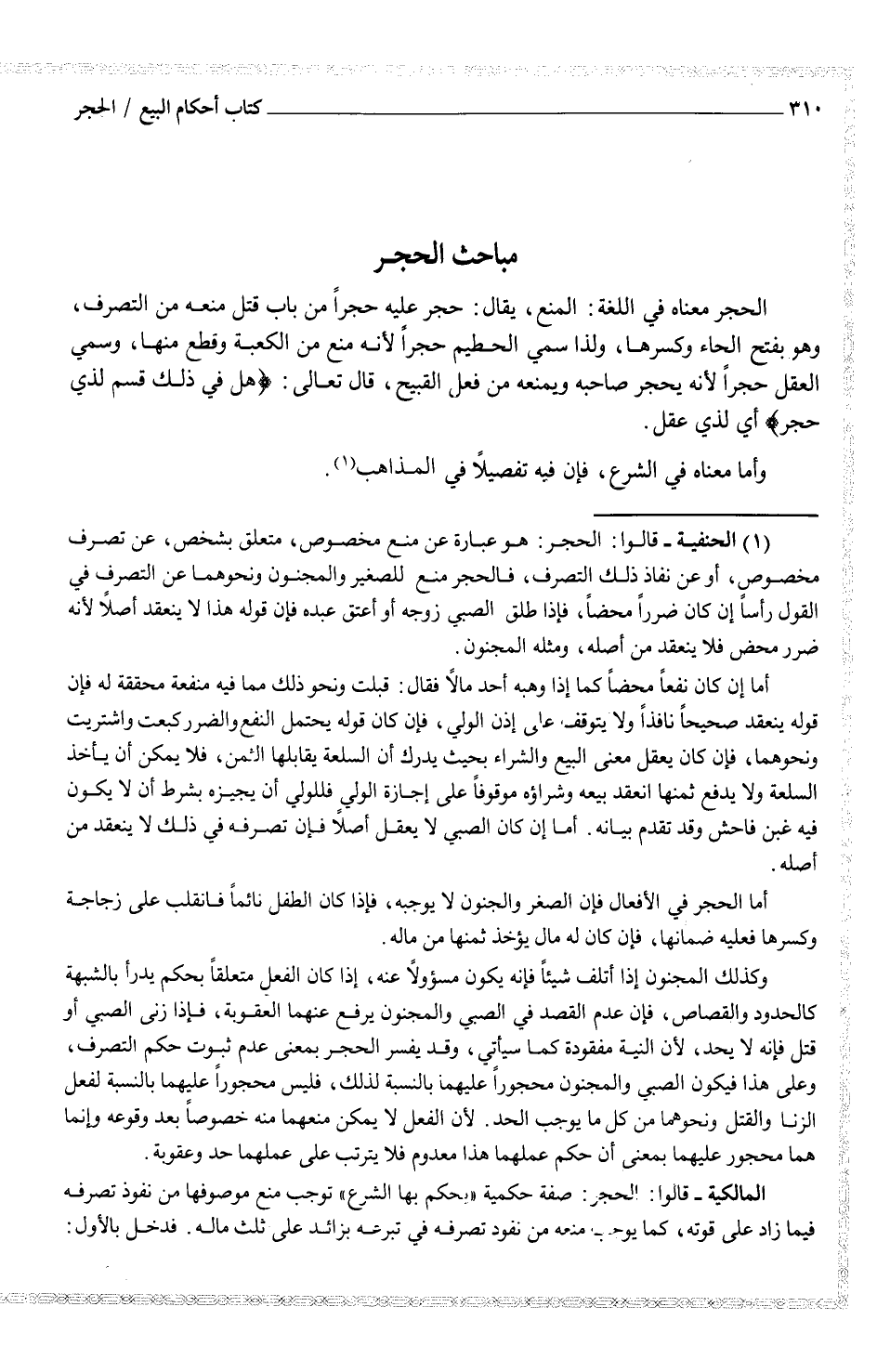 (¬1) الحنفية - قالوا: الحجر: هو عبارة عن منع مخصوص، متعلق بشخص، عن تصرف مخصوص، أو عن نفاذ ذلك التصرف، فالحجر منع للصغير والمجنون ونحوهما عن التصرف في القول رأساً إن كان ضرراً محضاً، فإذا طلق الصبي زوجه أو أعتق عبده فإن قوله هذا لا ينعقد أصلاً لأنه ضرر محض فلا ينعقد من أصله، ومثله المجنون.