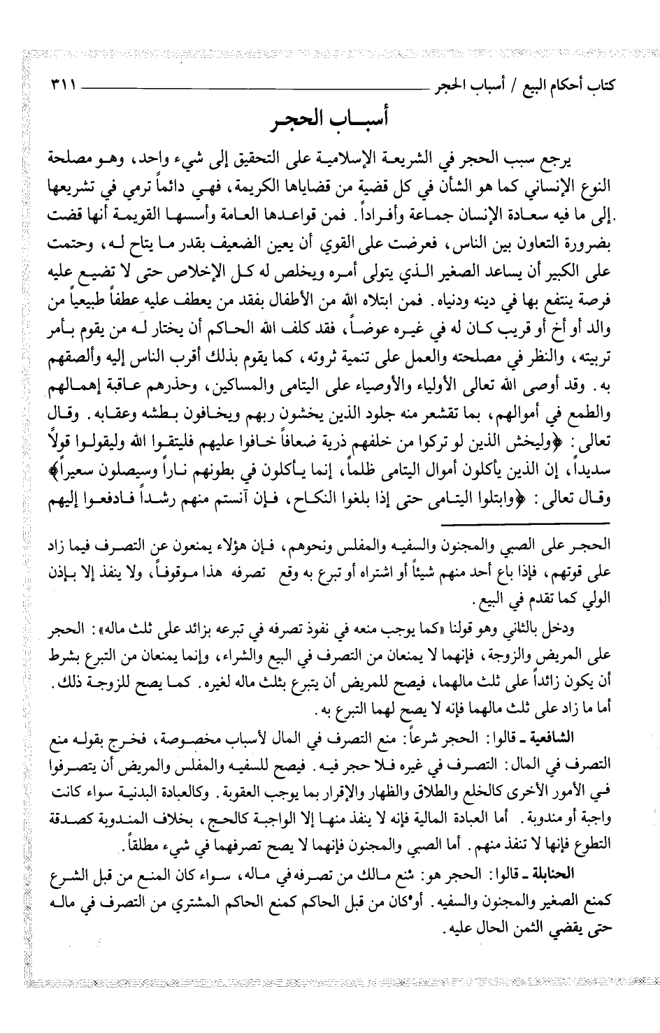 يرجع سبب الحجر في الشريعة الإسلامية على التحقيق إلى شيء واحد، وهو مصلحة النوع الإنساني كما هو الشأن في كل قضية من قضاياها الكريمة، فهي دائماً ترمي في تشريعها إلى ما فيه سعادة الإنسان جماعة وأفراداً. فمن قواعدها العامة وأسسها القويمة أنها قضت بضرورة التعاون بين الناس، فعرضت على القوي أن يعين الضعيف بقدر ما يتاح له، وحتمت على الكبير أن يساعد الصغير الذي يتولى أمره ويخلص له كل الإخلاص حتى لا تضيع عليه فرصة ينتفع بها في دينه ودنياه. فمن ابتلاه الله من الأطفال بفقد من يعطف عليه عطفاً طبيعياً من والد أو أخ أو قريب كان له في غيره عوضاً، فقد كلف الله الحاكم أن يختار له من يقوم يأمر تربيته، والنظر في مصلحته والعمل على تنمية ثروته، كما يقوم بذلك أقرب الناس إليه والصقهم به. وقد أوصى الله تعالى الأولياء والأوصياء على اليتامى والمساكين، وحذرهم عاقبة إهمالهم والطمع في أموالهم، بما تقشعر منه جلود الذين يخشون ربهم ويخافون بطشه وعقابه. وقال تعالى: {وليخش الذين لو تركوا من خلفهم ذرية ضعافاً خافوا عليهم فليتقوا الله وليقولوا قولاً سديداً، إن الذين يأكلون أموال اليتامى ظلماً، إنما يأكلون في بطونهم ناراً وسيصلون سعيراً} وقال تعالى: {وابتلوا اليتامى حتى إذا بلغوا النكاح، فإن آنستم منهم رشداً فادفعوا إليهم وقال تعالى: {وابتلوا اليتامى حتى إذا بلغوا النكاح، فإن آنستم منهم رشداً فادفعوا إليهم