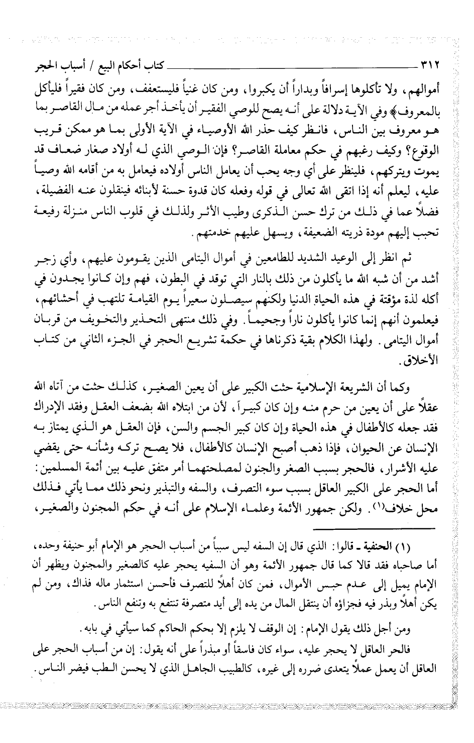 وكما أن الشريعة الإسلامية حثت الكبير على أن يعين الصغير، كذلك حثت من آتاه الله عقلاً على أن يعين من حرم منه وإن كان كبيراً، لأن من ابتلاه الله بضعف العقل وفقد ادراك فقد جعله كالأطفال في هذه الحياة وإن كان كبير الجسم والسن، فإن العقل هو الذي يمتاز به الإنسان عن الحيوان، فإذا ذهب أصبح الإنسان كالأطفال، فلا يصح تركه وشأنه حتى يقضي عليه الأشرار، فالحجر بسبب الصغر والجنون لمصلحتهما أمر متفق عليه بين أئمة المسلمين: أما الحجر على الكبير العاقبل بسبب سوء التصرف، والسفه والتبذير ونحو ذلك مما يأتي فذلك محل خلاف (¬1) . ولكن جمهور الأئمة وعلماء الإسلام على أنه في حكم المجنون والصغير،