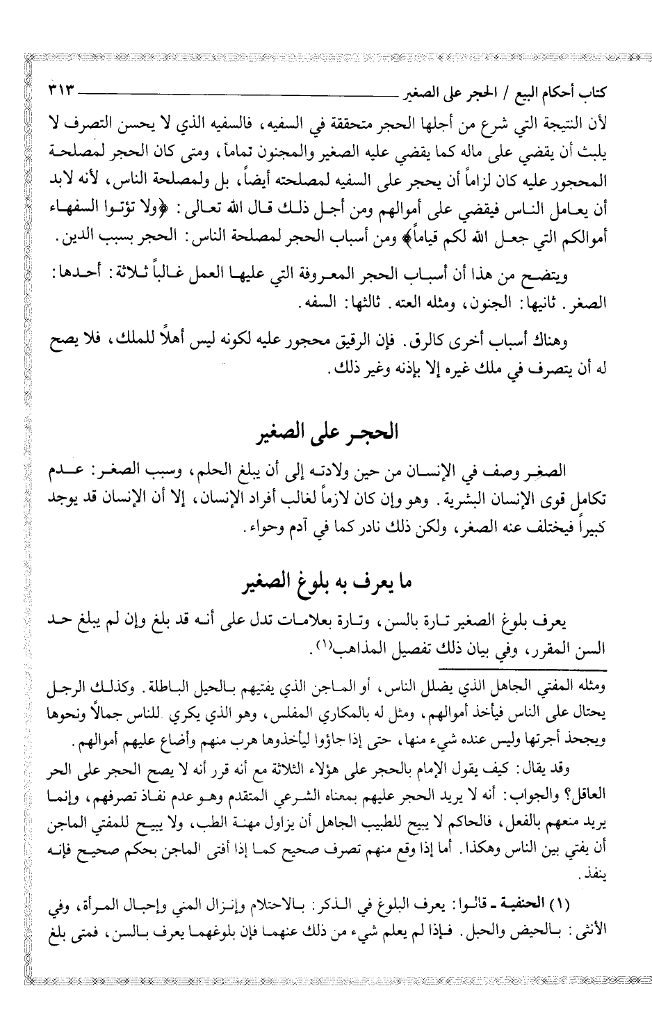 ويتضح من هذا أن أسباب الحجر المعروفة التي عليها العمل غالباً ثلاثة: أحدها: الصغر. ثانيها: الجنون، ومثله العته. ثالثهاً: السفه.