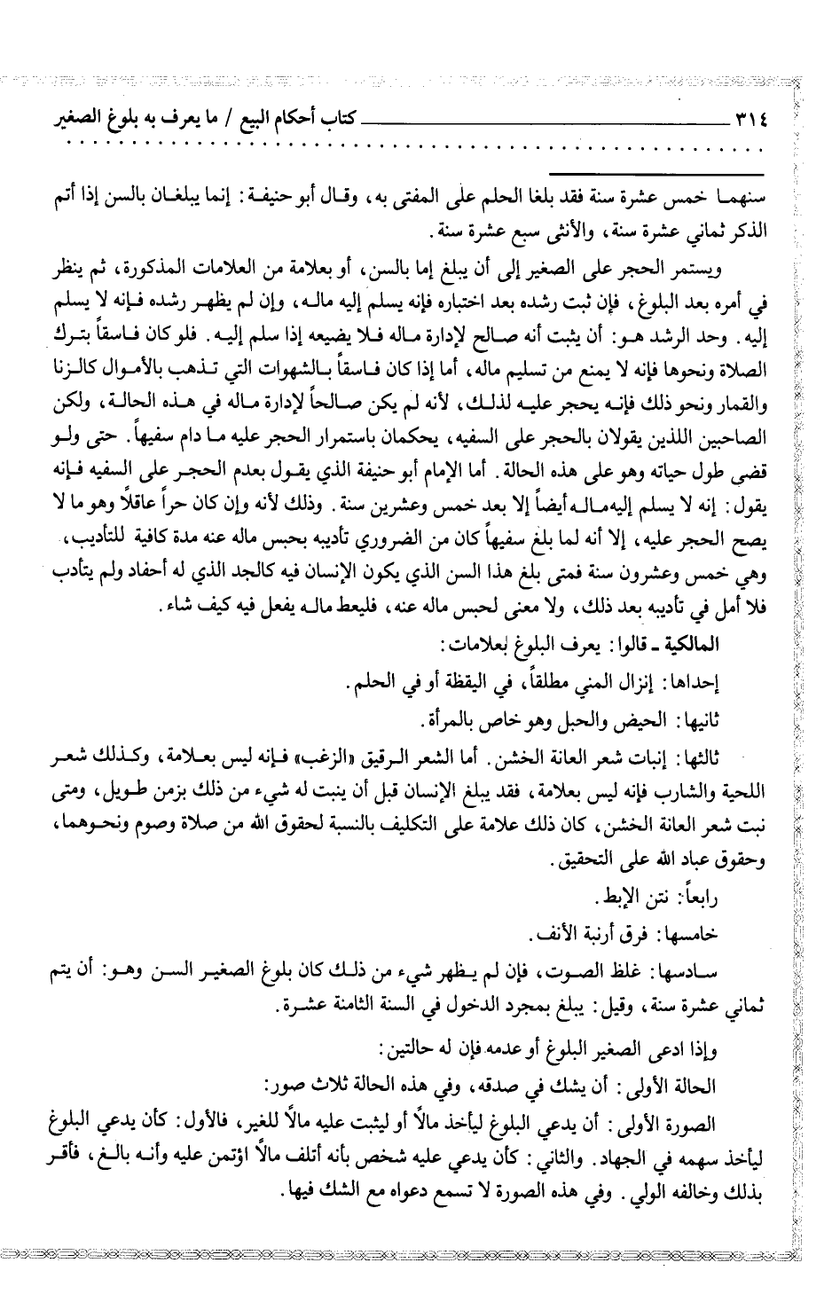سادسها: غلظ الصوت، فإن لم يظهر شيء من ذلك كان بلوغ الصغير السن وهو أن يتم ثماني عشرة سنة، وقيل: يبلغ بمجرد الدخول في السنة الثامنة عشرة.