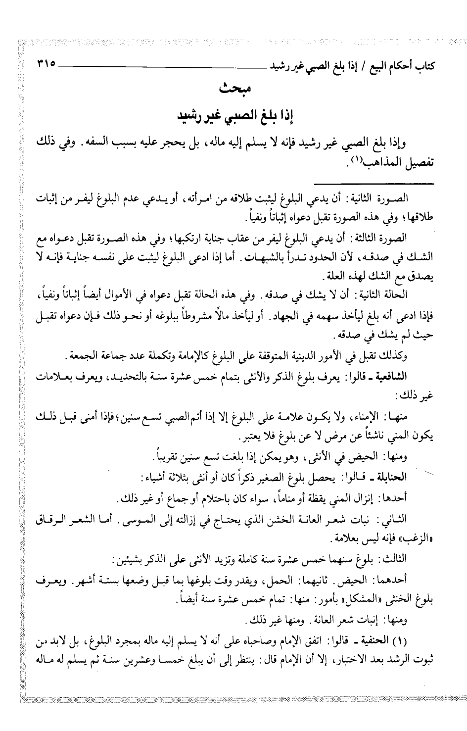 (¬1) الحنفية - قالوا: اتفق الإمام وصاحباه على أنه لا يسلم إليه ماله بمجرد البلوغ، بل لا بد من ثبوت الرشد بعد الاختبار، إلا أن الإمام قال: ينتظر إلى أن يبلغ خمسا وعشرين سنة ثم يسلم له ماله