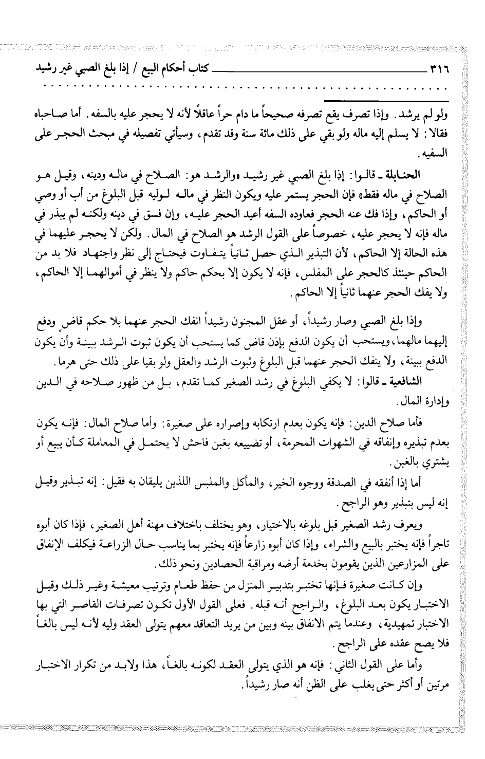 الحنابلة - قالوا: إذا بلغ الصبي غير رشيد "والرشد هو: الصلاح في ماله ودينه، وقيل هو الصلاح في ماله فقط" فإن الحجر يستمر عليه ويكون النظر في ماله لوليه قبل البلوغ من أب أو وصي أو الحاكم، وإذا فك عنه الحجر فعاوده السفه أعيد الحجر عليه، وإن فسق في دينه ولكنه لم يبذر في ماله فإنه لا يحجر عليه، خصوصاً على القول الرشد هو الصلاح في المال. ولكن لا يحجر عليهما في هذه الحالة إلا الحاكم، لأن التبذير الذي حصل ثانياً يتفاوت فيحتاج إلى نظر واجتهاد فلا بد في الحاكم حينئذ كالحجر على المفلس، فإنه لا يكون إلا بحكم حاكم ولا ينظر في أموالهما إلا الحاكم، ولا يفك الحجر عنهما ثانياً إلا الحاكم.