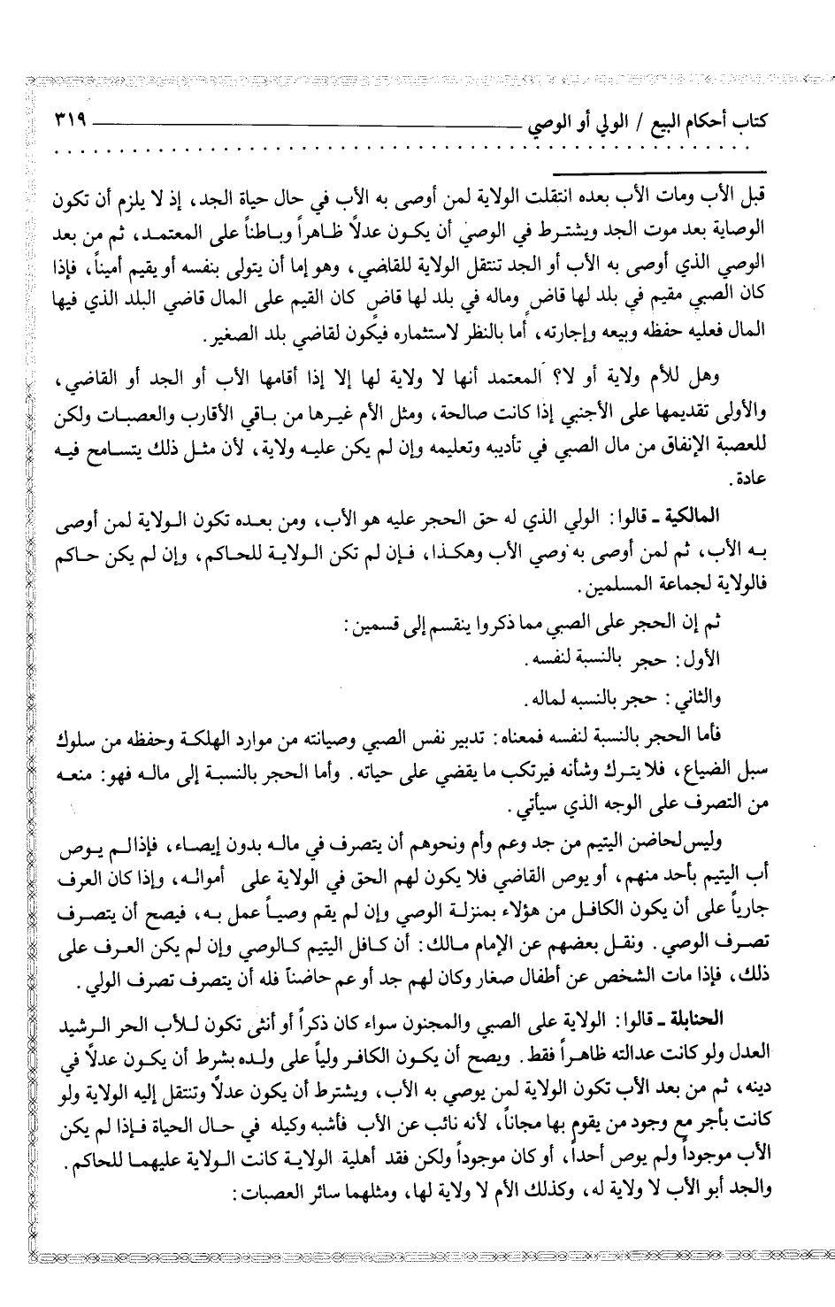قبل الأب ومات الأب بعد انتقلت الولاية لمن أوصى به الأب في حال حياة الجد، إذ لا يلزم أن تكون الوصاية بعد موت الجد ويشترط في الوصي أن يكون عدلاً ظاهراً وباطناً على المعتمد، ثم من بعد الوصي الذي أوصى به الأب أو الجد تنتقل الولاية للقاضي، وهو إما أن يتولى بنفسه أو يقيم أميناً، فإذا كان الصبي مقيم في بلد لها قاضٍ وماله في بلد لها قاضٍ كان القيم على المال قاضي البلد الذي فيها المال فعليه حفظه وبيعه وإجارته، أما بالنظر لاستثماره فيكون لقاضي بلد الصغير.