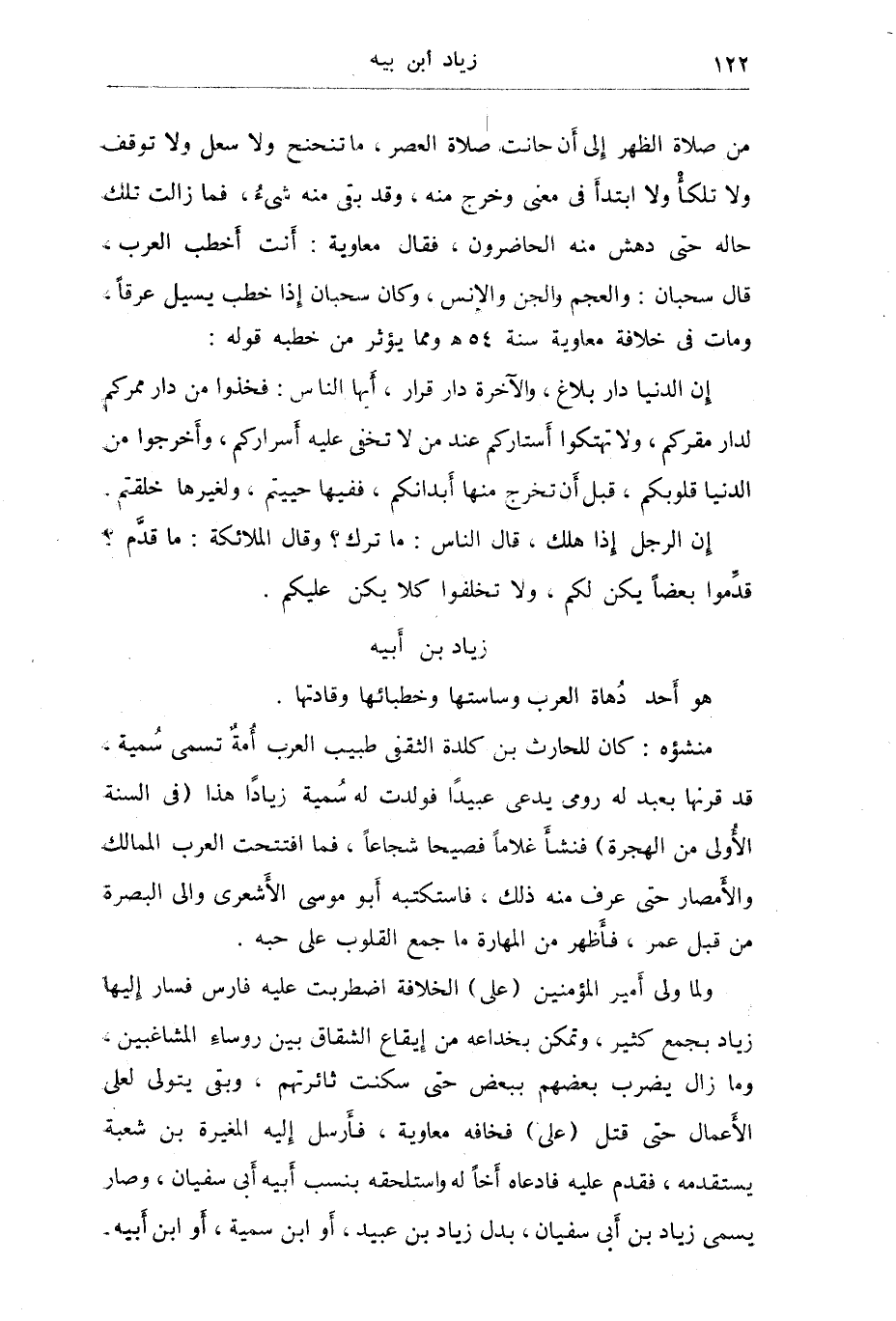 وولاه معاوية العراقين وهو أول من جمع له بينهما فسار في الناس سيرة لم بها الشعث وأقام بها المعوج وكبح الفتنة واشتط في العقوبة وأخذ بالظنة وعاقب على الشهة حتى شمل خوفه جميع الناس فأمن بعهم بعضاً وكان الشيء يسقط من يد الرجل أو المرأة فلا يعرض له أحد حتى يأبى صاحبه فيأخذه بل كان لا يغلق أحد بابه وكان زياد يقول: (لو ضاع حبل بيني وبين خراسان لعرفت آخذه) وكان مكتوباً في مجلس عنوان سياسته وهي (الشدة في غير عنف واللين في غير ضعف المحسن سيجازى بإحسانه والمسيء يعاقب بإساءته) وتوفي بالكوفة في رمضان سنة 53هـ?.