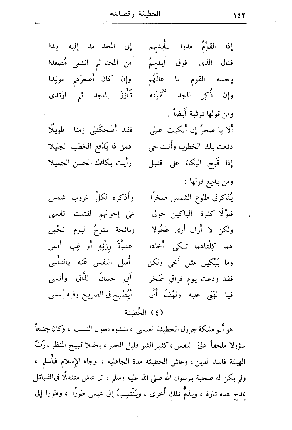 شعره: لولا ما وصم به الحطيئة من خسة النفس ودناءة الخلق وجهالة النسب لكان بإجادته في كل ضرب من ضروب الشعر شاعر المخضرمين على الإطلاق إلا أنه لم يقف ببراعته وفصاحته موقفاً لله ولا للشرف، وقلما يوجد في كلام الحطيئة مظنة ضعف أو مغمز لغامز من ركاكة لفظ أو غضاضة معنى أو اضطراب قافية ومن مدحه الذي لا يلحق فيه غبار قوله: