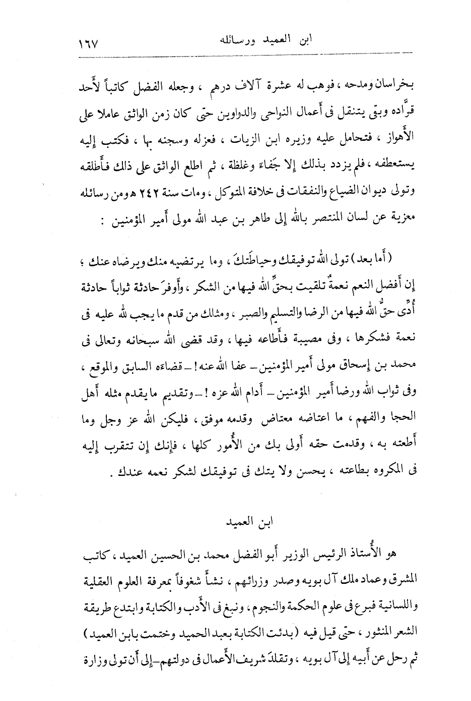 ومن رسائله: كتابي إليك وأنا بحال لو لم ينغصها الشوق إليك ولم يرنق صفوها النزوع نحوك لعددتها من الأحوال الجميلة، وأعددت حظي منها في النعم الجليلة. فقد جمعت فيها بين سلامة عامة. ونعمة تامة. وحظيت منها في جسمي بصلاح وفي سعيي بنجاح، لكن ما بقي أن يصفو لي عيش مع بعدي عنك ويخلو ذرعي مع خلوي منك، ويسوغ لي مطعم ومشرب مع انفرادي دونك وكيف أطمع في ذلك وأنت جزء من نفسي وناظم لشمل أنسي وقد حرمت رؤيتك وعدمت مشاهدتك وهل تسكن نفس متشعبة ذات انقسام وينفع أنس بيت بلا نظام، وقد قرأت كتابك جعلني الله فداك فامتلأت سروراً بملاحظة خطك وتأمل تصرفك في لفظك وما أقرظهما فكل خصالك مقرظ عندي. وما أمدحهما فكل أمر ممدوح في ضميري وعقلي.