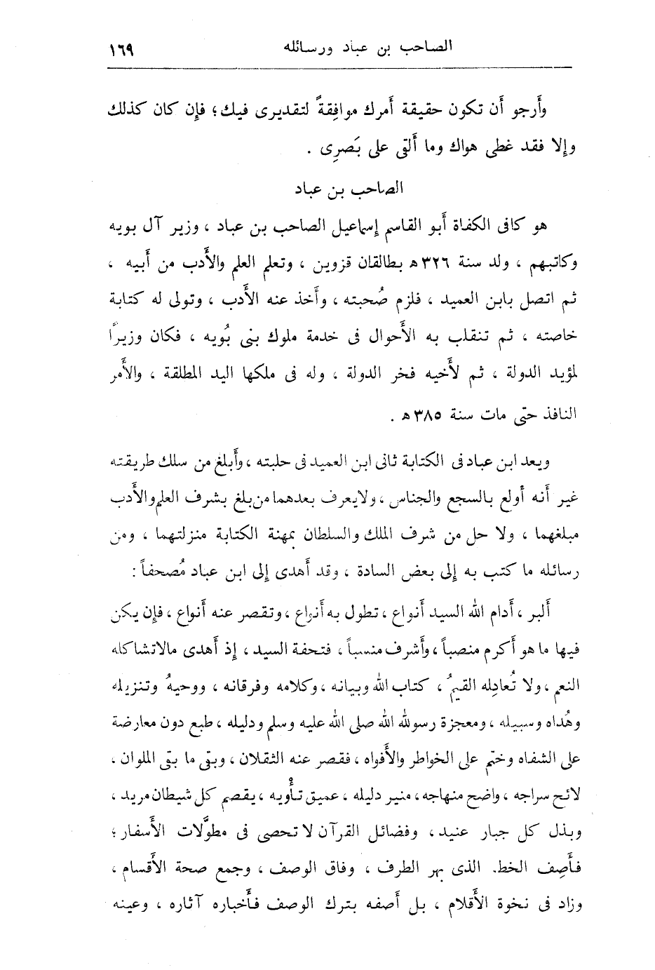 آثاره وعينه فراره وحقاً أقول إني لا أحسب أحداً ما خلا الملوك جمع من المصاحف ما جمعت وابتدع في استكتابها ما ابتدعت، وإن هذا المصحف لزائد عن جميعها زيادة الفرع على الغرة بل زيادة الحج على العمرة.