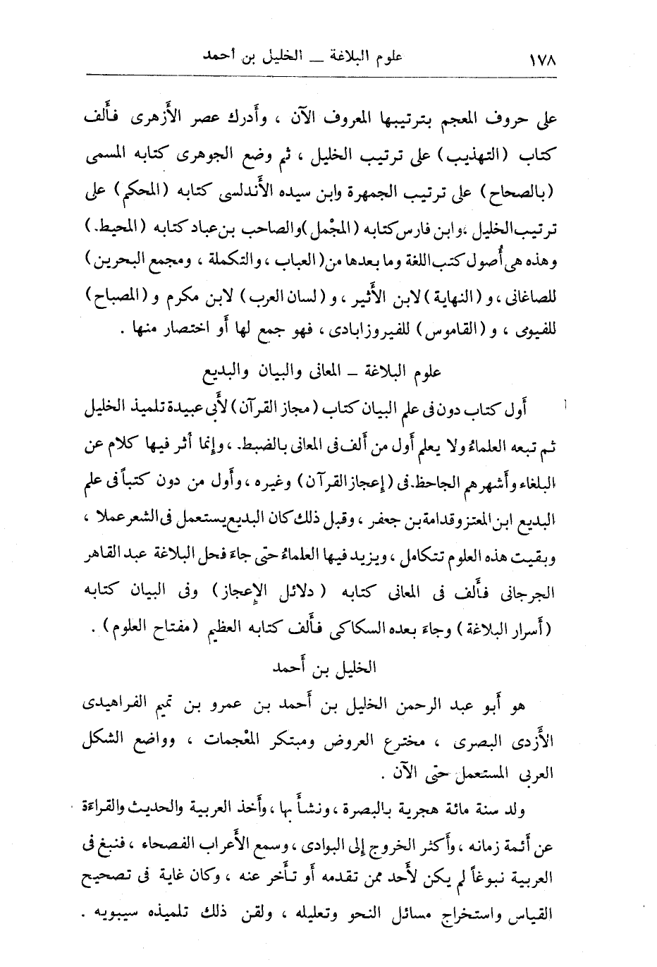 "العين" وتدوينه كتاباً دقيقاً في الموسيقى على غير معرفة بلغة أجنبية واشتغال بلهو، وزاد في الشطرنج قطعة سماها جملاً لعب بها الناس زمناً، وبقي الخليل مقيماً بالبصرة طول حياته زاهداً متعففاً مكباً على العلم والتعليم حتى مات في أوائل خلافه الرشيد سنة 174 هـ? بصدمة في دعامة مسجد ارتج منها دماغه.