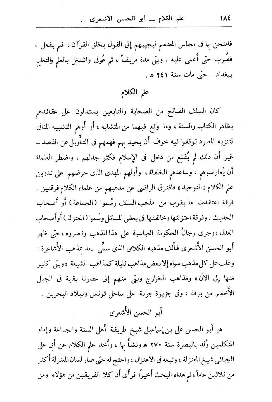 ومن المعتزلة غال في نظره، فتوسط وتغيب عن الناس مدة ألف فيها كتبه في نصرة أهل السنة والرد على أكثر عقائد المعتزلة؛ وكان شافعي المذهب، توفي سنة 324 هـ? وممن نصر مذهبه الفجر الرازي والغزالي وقاربه في مذهبه القاضي أبو منصور الماتريدي.