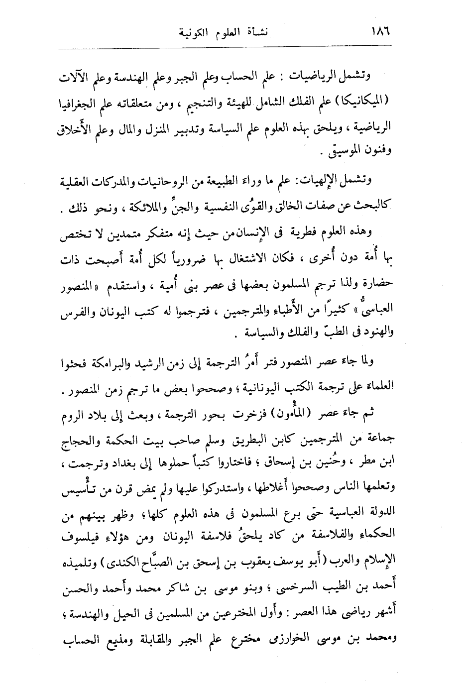 وكان لدولة الفواطم في مصر اشتغال بهذه العلوم فاشتهر في دولتهم في الفلك والرياضيات ابن يونس، وفي الطب ابن رضوان وغيرهما، ولم يعن أهل الأندلس بهذه العلوم عناية أهل المشرق، وأشهر من نبع منهم فيها أبو الوليد القاضي أحمد بن رشد وأبو القاسم الزهراوي، ومن كتب هؤلاء الأئمة وأمثالهم اقتبس أهل (أوربا) كثيراً من أصول مدينتهم الحاضرة.