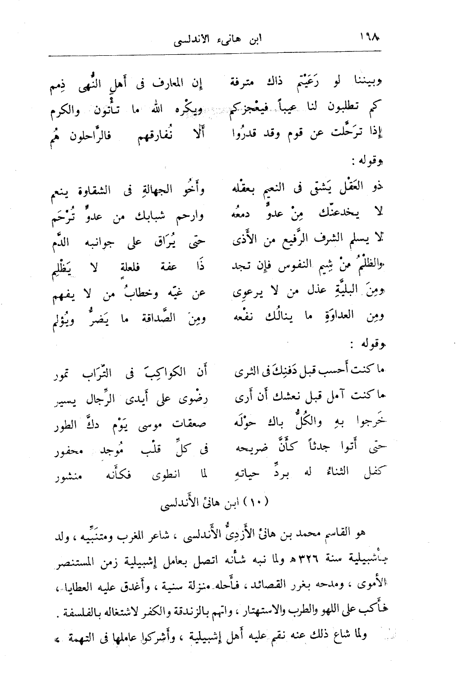 شعره: لم ينبغ في شعراء جزيرة الأندلس ولا بر المغرب جميعهما من يفوق ابن هانئ في صناعة الشعر أو يساويه فقد كان عندهم في الشهرة والإجادة وشرف الشعر بمنزلة المتنبي عند المشارقة ويسميه كثير من الأدباء بمتنبي المغرب.