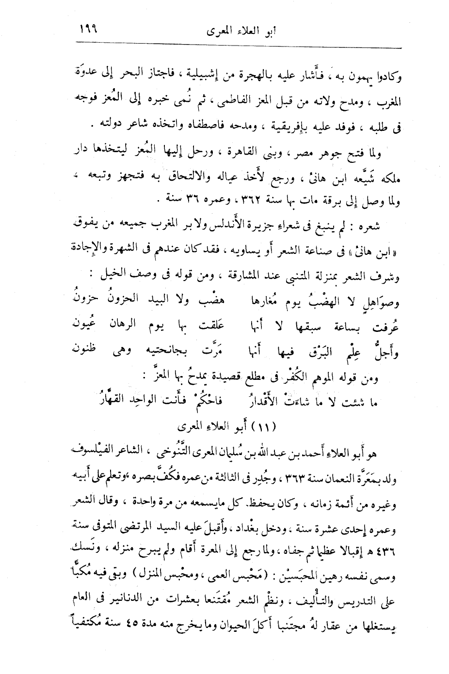 شعره: وله كثير من الشعر يناقض بعضه في حقيقة العالم والشرائع والمعبود وللناس في اعتقاده أقوال كثيرة والظاهر أنه كان شاكاً متحيراً وهو أحكم الشعراء بعد المتنبي ويفضل عليه في الطبيعيات والاجتماعيات والأخلاق والقوانين والفلسفة والشرائع والأديان. ومن مراثيه قوله: