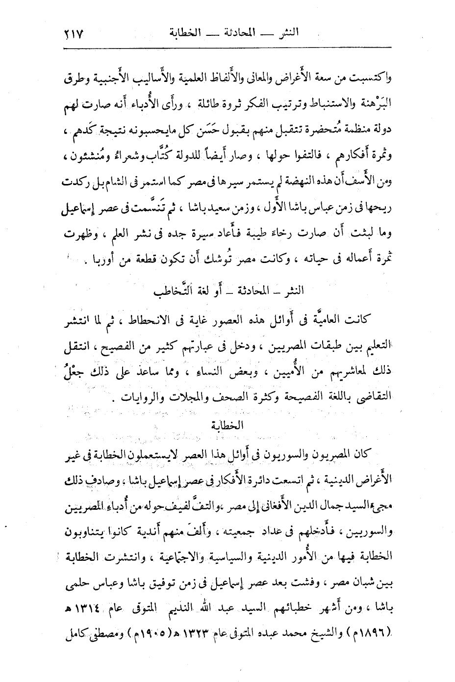 كان المصريون والسوريون أوائل هذا العصر لا يستعملون الخطابة في غير الأغراض الدينية، ثم اتسعت ائرة الأفكار في عصر إسماعيل باشا، وصادف ذلك مجيء السيد جمال الدين الأفغاني إلى مصر، والتف خوله لفيف من أدباء المصريين والسوريين، فأدخلهم في عداد جمعيته وألف منهم أندية كانوا ينتابون الخطابة فيها في الأمور الدينية السياسية والاجتماعية، وانتشرت الخطابة بين شبان مصر وفشت بعد عصر إسماعيل في زمن توفيق باشا وصاحب السمو الخديوي عباس باشا الثاني: ومن أشهر خطبائهم السيد عبد الله النديم، والشيخ محمد عبده، ومصفى باشا كامل، ومحمد بك فريد، وسعد باشا غلول، والشيخ عبد العزيز جاويش وغيرهم، حتى بلغت الخطابة في عصرنا هذا مبلغاً عظيماً.
