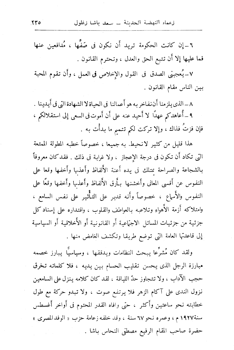 وبالجملة فمعالي الرئيس متشرع يبحث النظامات ويدققها. وسياسي يبارز خصمه مبارزة الرجل الذي يحسن تقليب الحسام بين يديه، فلا كلماته تخرق حجب الآداب ولا تتجاوز حد اللياقة، ولقد كان كلامه ينزل على السامعين نزول الندى على أكام الزهر فلا يرتفع صوت ولا تبدو حركة مع طول خطابته نحو ساعتين، نسأله سبحانه وتعالى أن يمن على مصر والسودان بالاستقلال التام وأن يمنحها الحرية على يد بطلها العظيم وزعيمها الجليل ورئيسها المحبوب "سعد باشا زغلول" حفظه الله آمين.