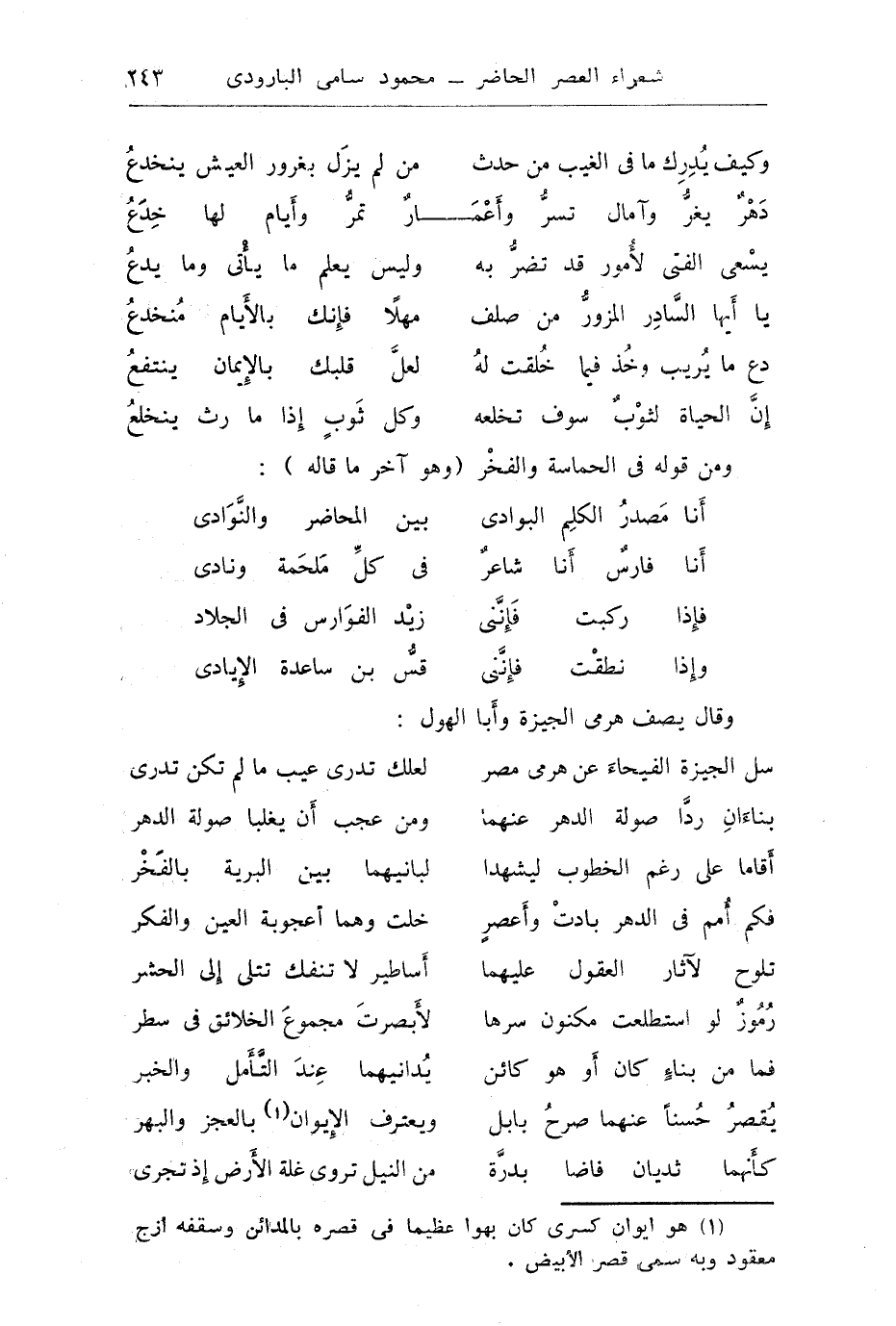 شعره، ينظم بين أصحابه فيكون معهم وليس معهم، وينظم حين يشاء، وحيث يشاء، لا يجهد فكره ولايكده في معنى أو في مبنى، فأما المعنى فيجيئه على مرامه أو على أبعد من مرامه ولاينضب عنده لأنه يستخلصه من عقل فوار الذكاء ومعارف جامعة إلى أفانين الآداب في لغات الإفرنج والأعراب، فلسفة الحقوق وحقائق وحقائق التاريخ، وغرائب السير التي يحفظ منها غير يسير إلى مشاركات علمية وتنبيهات فنية استفادها من مطالعته في صنوف الكتب، واتخذها عن ملحوظاته ومسموعاته في جولاته بين بلاد الشرق والغرب. وأما المبني فله فيه اذواق متعددة مقامات القول: ترى فيه من نسج البحتري ومن صياغة أبي تمام ومن ثبات المتنبي، ومن مفاجآت الشريف، ومن مسلسلات مهيار.