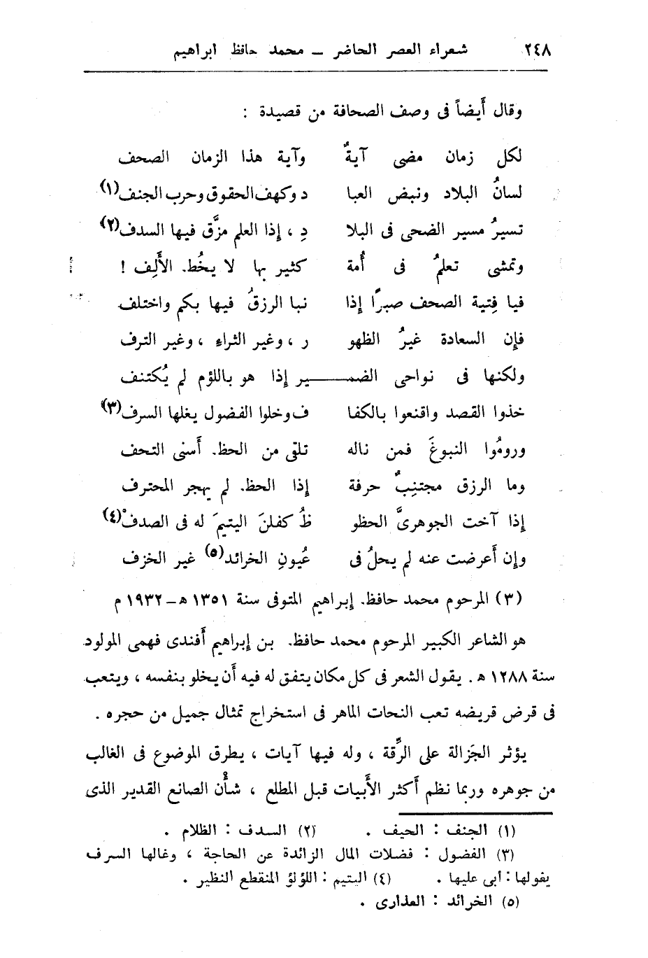 حاضر المحفوظ من أفصح أساليب العرب ينسج على منوالها ويتخير نفائس مفرداتها وأعلاق حلاها. له غرام باللفظ لايقل عن الغرام بالمعنى. وفي أقصى ضميره يؤثر البيت المجاد لفظاً على المجاد معنى. فإذا فاته الابتكار حيناً في التصوير، أولع بالاجتماعيات فقال فيها وأجاد ما شاء، فهو على الجملة أحد الثلاثة الذين هم نجوم الأدب العربي في مصر لهذا العصر، ولكل من تلك النجوم منزلة وإضاءته وأثره الخالد.