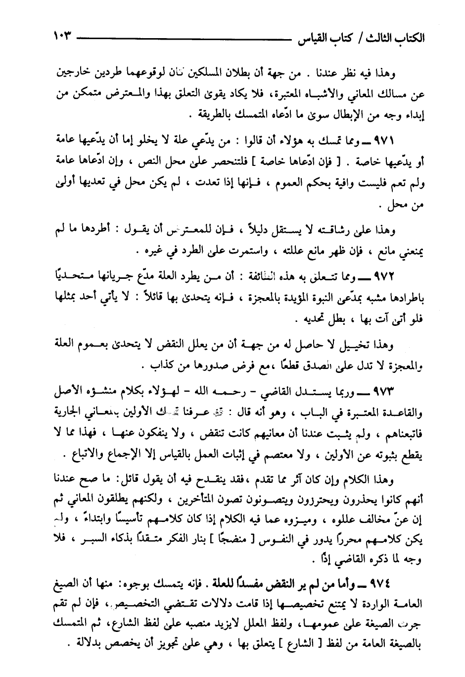 973- وربما يستدل القاضي رحمه الله لهؤلاء بكلام منشؤه الأصل والقاعدة المعتبرة في الباب وهو أنه قال قد عرفنا تمسك الأولين بالمعاني الجارية فاتبعناهم ولم يثبت عندنا أن معانيهم كانت تنقض ولا ينفكون عنها فهذا مما لا يقطع بثبوته عن الأولين ولا معتصم في إثبات العمل بالقياس إلا الإجماع والاتباع.