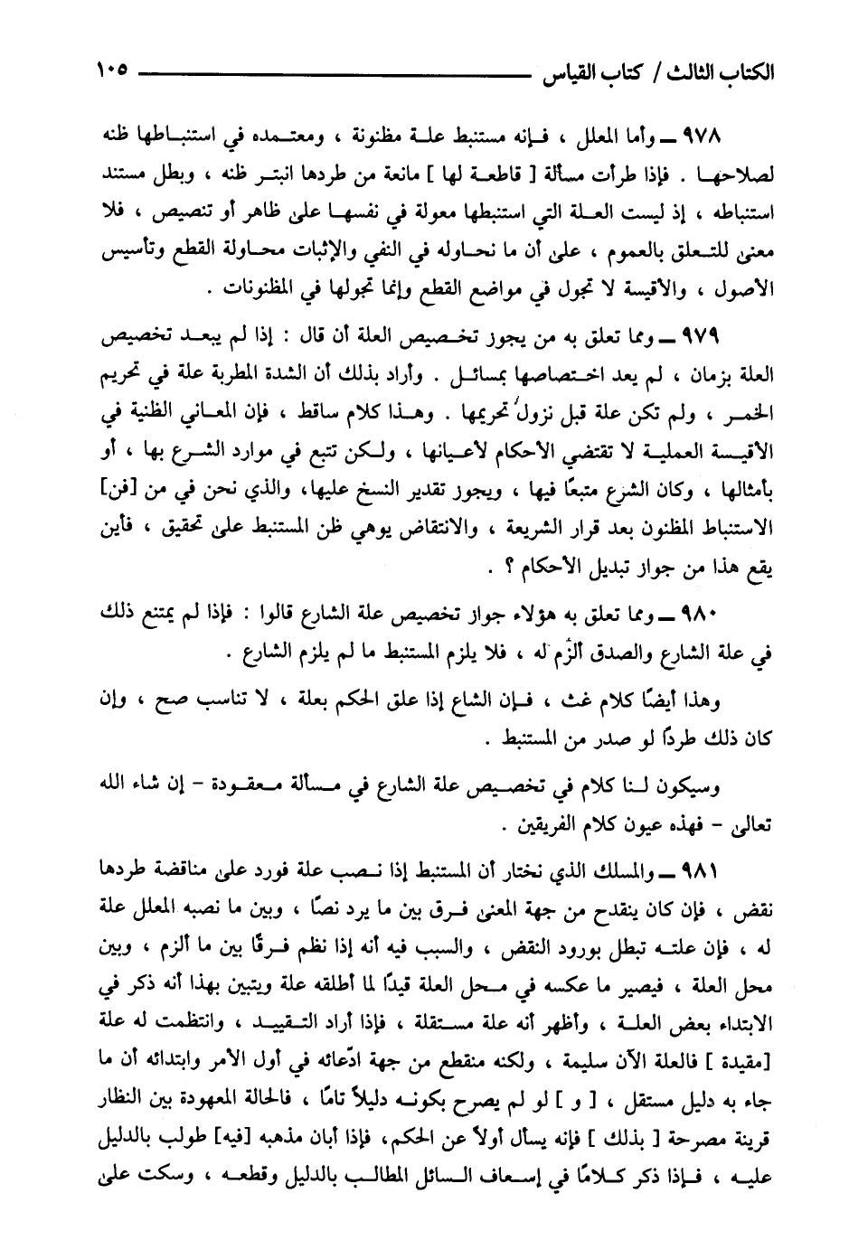 978- وأما المعلل فإنه مستنبط علة مظنونة ومعتمدة في استنباطها ظنه لصلاحها فإذا طرأت مسألة [قاطعة لها] مانعة من طردها انبتر ظنه وبطل مستند استنباطه إذ ليست العلة التي استنبطها معولة في نفسها على ظاهر أو تنصيص فلا معنى للتعلق بالعموم على أن ما نحاوله في النفي والإثبات محاولة القطع وتأسيس الأصول والأقيسة لا تجول في مواضع القطع وإنما تجولها في المظنونات.