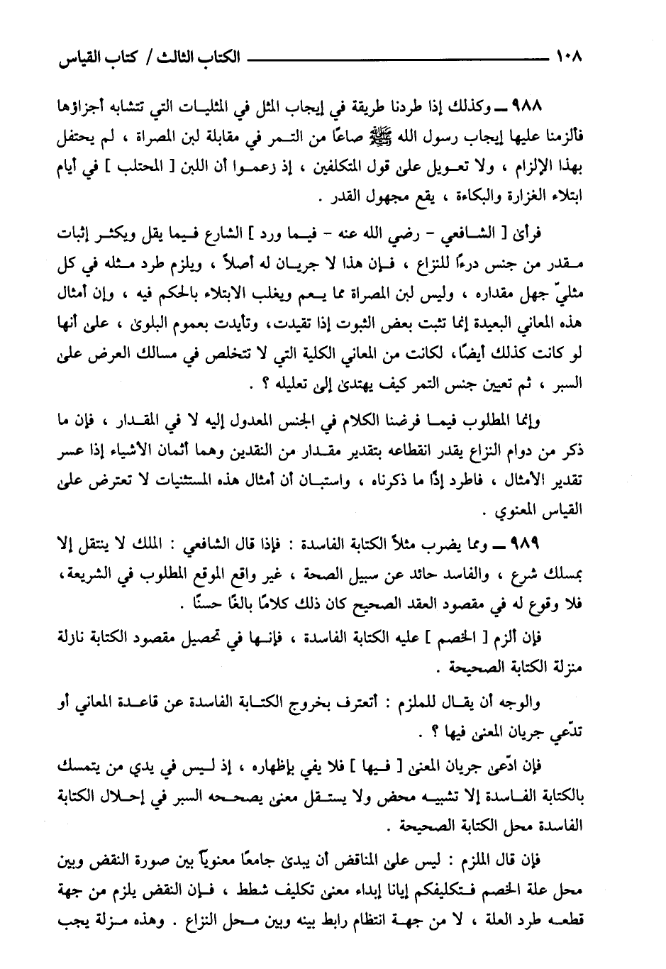 989- ومما يضرب مثلا الكتابة الفاسدة فإذا قال الشافعي الملك لا ينتقل إلا بمسلك شرعي والفاسد حائد عن سبيل الصحة غير واقع الموقع المطلوب في الشريعة فلا وقوع له في مقصود العقد الصحيح كان ذلك كلاما بالغا حسنا.
