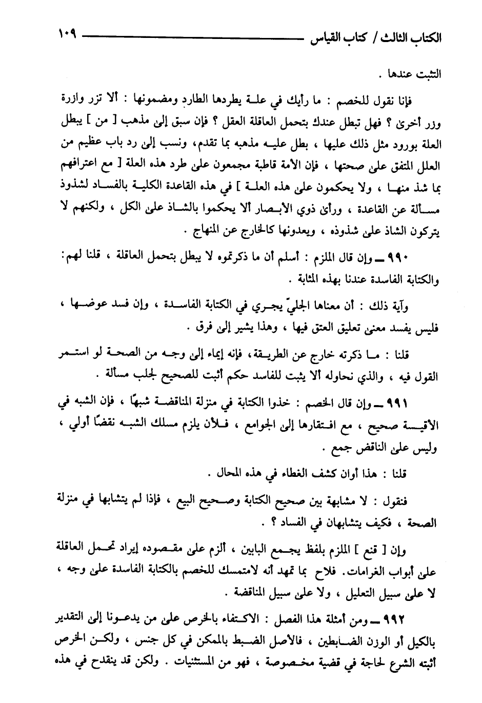 991- وإن قال الخصم: خذوا الكتابة في منزلة المناقضة شبها فإن الشبة في الأقيسة صحيح مع افتقارها إلى الجوامع فلأن يلزم مسلك الشبه نقضا أولى وليس على الناقض جمع.
