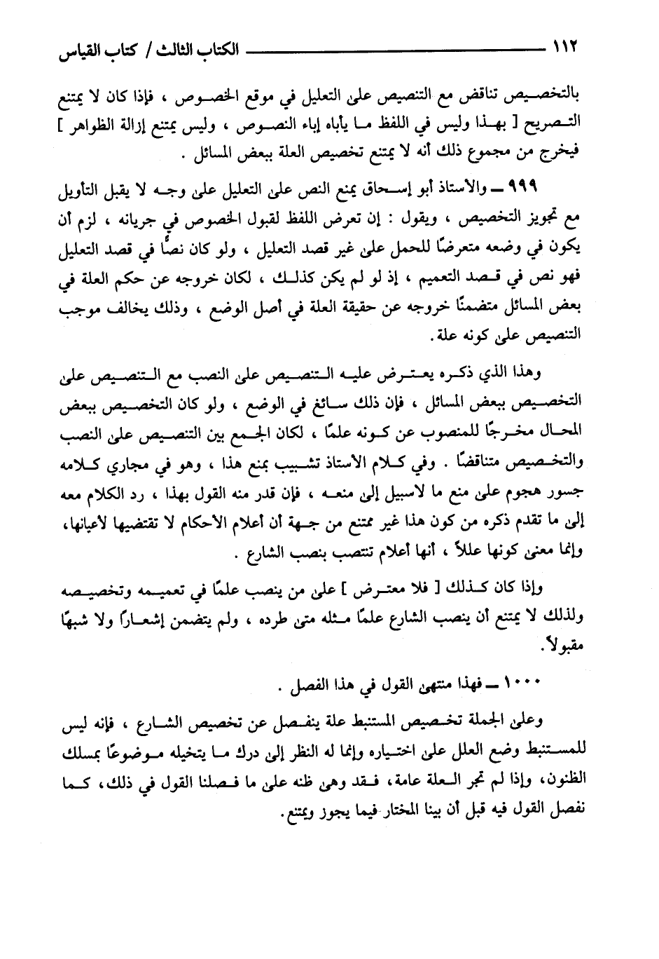 999- والأستاذ أبو إسحاق يمنع النص على التعليل على وجه لا يقبل التأويل مع تجويز التخصيص ويقول: إن تعرض اللفظ لقبول الخصوص في جريانه لزم أن يكون في وضعه متعرضا للحمل على غير قصد التعليل ولو كان نصا في قصد التعليل فهو نص في قصد التعميم إذ لو لم يكن كذلك لكان خروجه عن حكم العلة في بعض المسائل متضمنا خروجه عن حقيقة العلة في أصل الوضع وذلك يخالف موجب التنصيص على كونه علة.