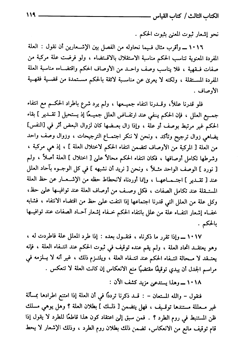 1017- وإذا تقرر ما ذكرناه فنقول بعده إذا طرد المعلل علة فاطردت له وهو يعتقد اتحاد العلة ولو يقم عنده توقيف في ثبوت الحكم عند انتفاء العلة فإنه يعتقد لا محالة انتفاء الحكم عند انتفاء العلة ويلتزم ذلك غير أنه لا يلزمه في مراسم الجدل أن يبدي توقيفا مقتضيا منع الانعكاس إن كانت العلة لا تنعكس.